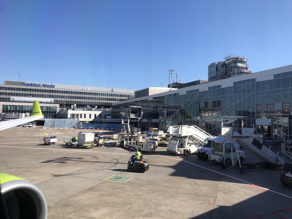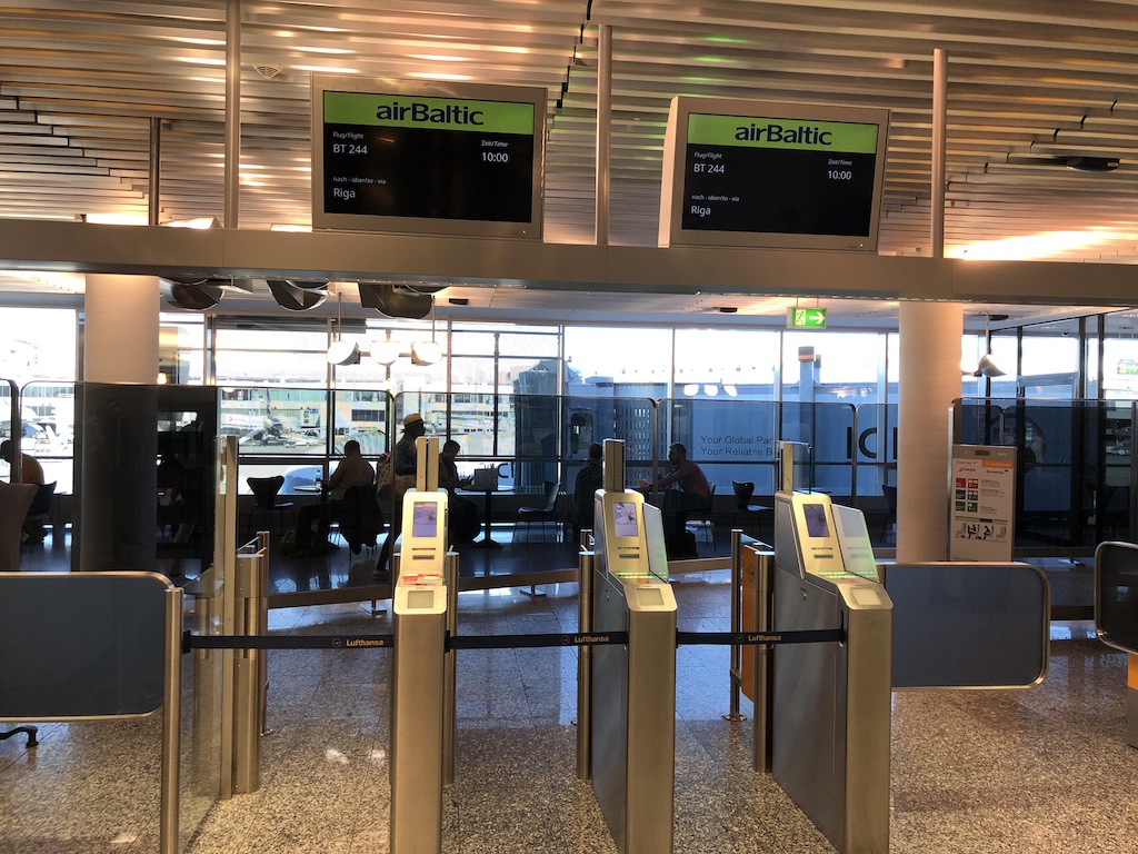 Gegen 8:30 Uhr morgens trudelten wir im leeren Terminal 1 des Frankfurter Flughafens ein, wo zur Zeit alle Abflüge abgefertigt werden. An den beiden Schaltern von airBaltic gab es keine Schlange und wir kamen sofort an die Reihe. Zunächst gab es noch Diskussionen wegen meines Koffers, ich wurde zunächst gebeten etwas vom Inhalt ins Handgepäck umzustauen.