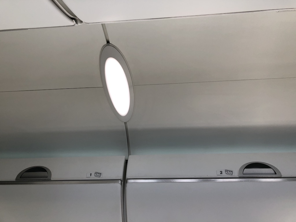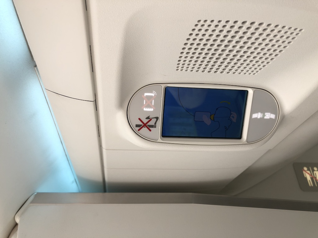 Über den meisten Sitzreihen befinden sich kleine Displays mit Informationen zum Flug, dem Routing und dem Sicherheitsvideo. Die Beleuchtung wurde im Flugverlauf mehrfach gewechselt, das Moodlight sorgte für eine angenehme Atmosphäre.