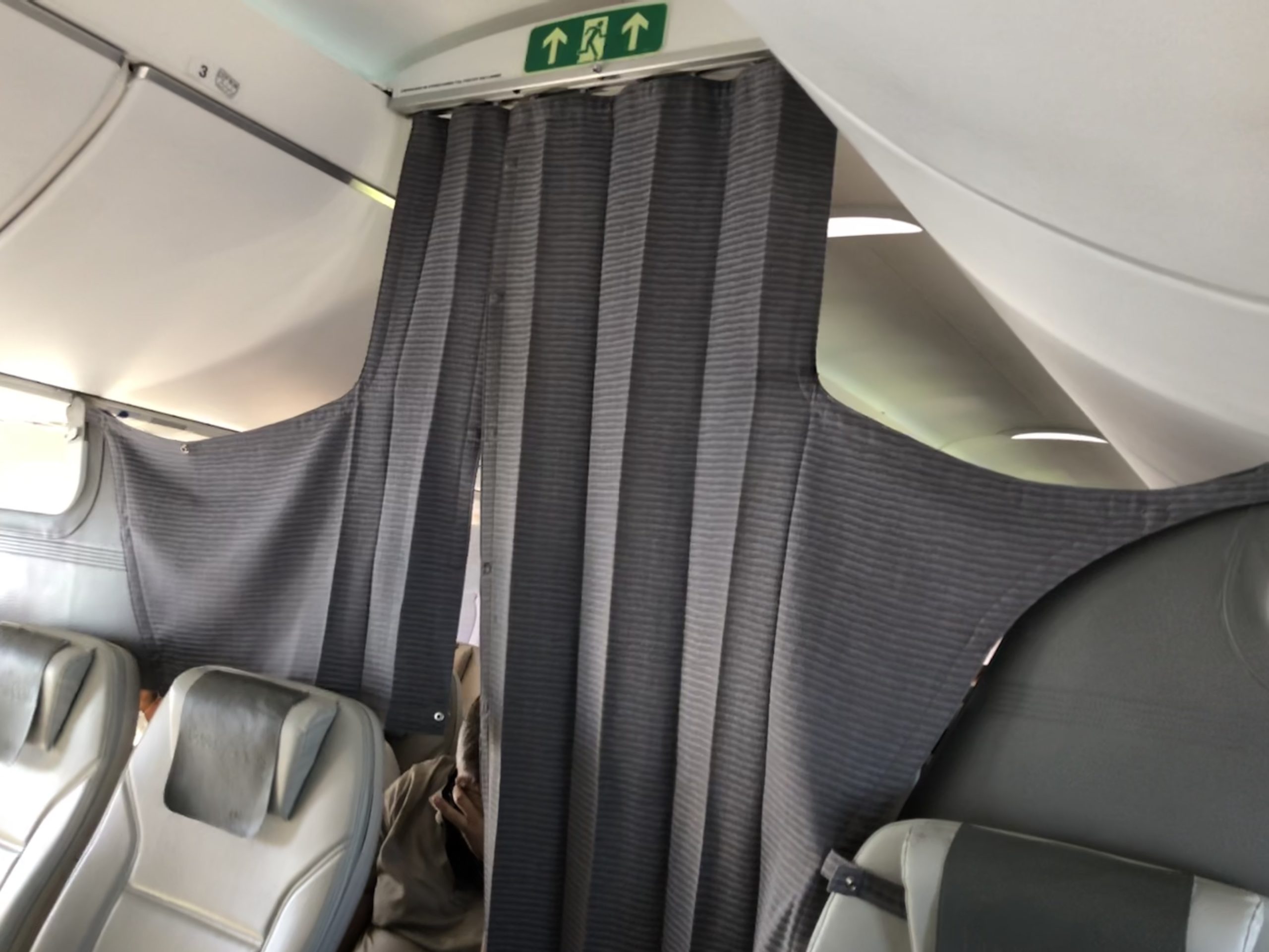 In der Business Class gab es sogar noch eine Garderobe. Die oberen Ablagefächer machen auch einen sehr geräumigen Eindruck. Die Kabine wurde mit dem typischen Vorhang zur Economy Class abgetrennt. Ein weiterer Faktor für ein gutes Raumgefühl, denn wir drei waren heute die einzigen Gäste in den vorderen Reihen.