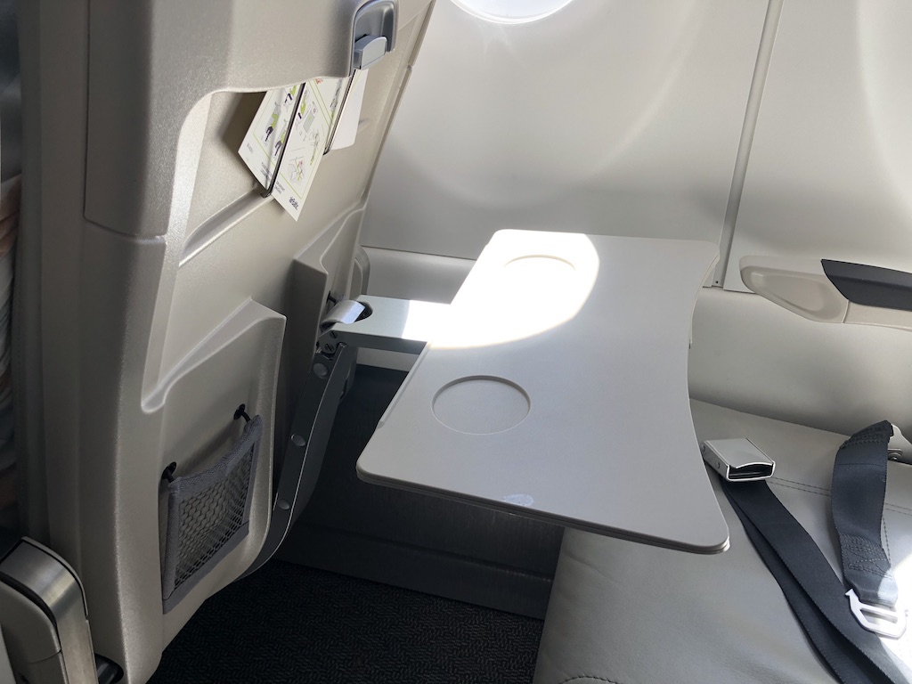 Ich hatte vom Schalter 3A zugewiesen bekommen und mich an Bord eine Reihe weiter nach vorne auf 2A umgesetzt. Die Beinfreiheit war sehr gut, der Klapptisch in der Armlehne aber winzig. Es weckte sofort Erinnerungen an den Flug mit der ehemaligen CSeries von Swiss. Die Klapptische in den dahinter liegenden Reihen sind da etwas stabiler. Für den Laptop und als Ablage für Getränke war die Mittelkonsole dann aber ganz praktisch.