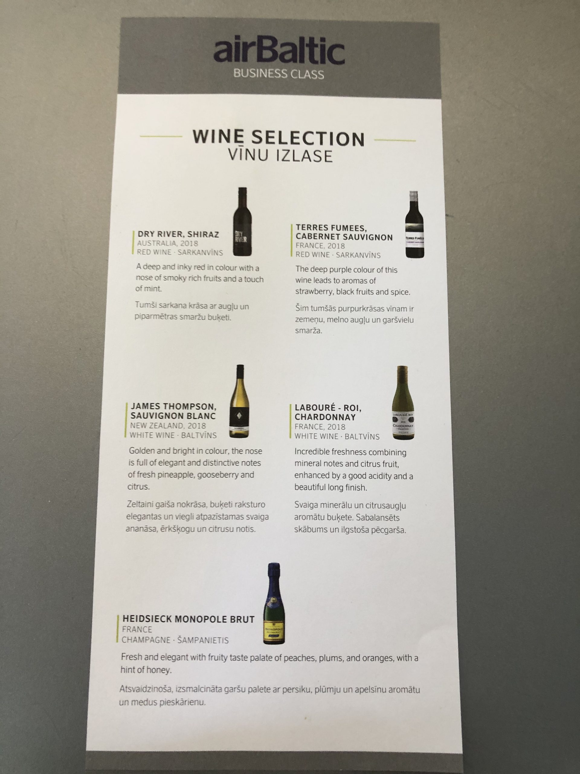 Nach dem Start verteilten die drei Flugbegleiterinnen Formulare zur Registrierung, diese wurden noch an Bord wieder eingesammelt. Die Getränkekarte war für den Flug sehr reichhaltig: neben Sotdrinks und Säften wurden Bier und jeweils zwei Rot- und Weißweine angeboten. Ich habe mich zum Start in den Urlaub für den Champagner von Heidsieck Monopole entschieden.