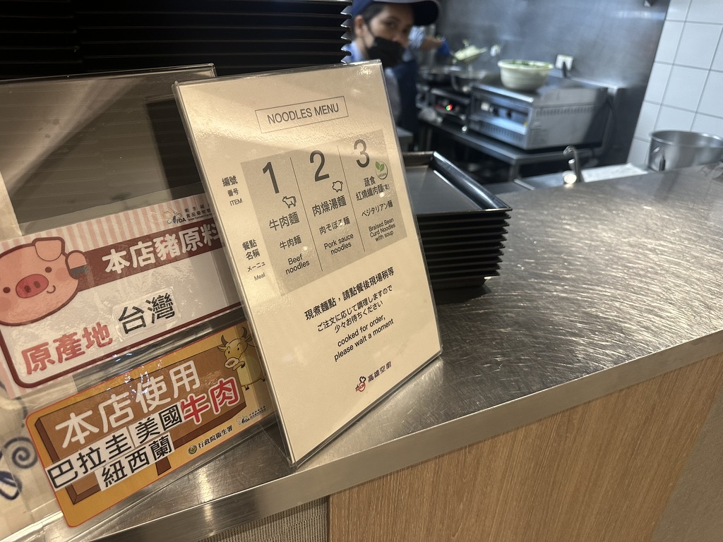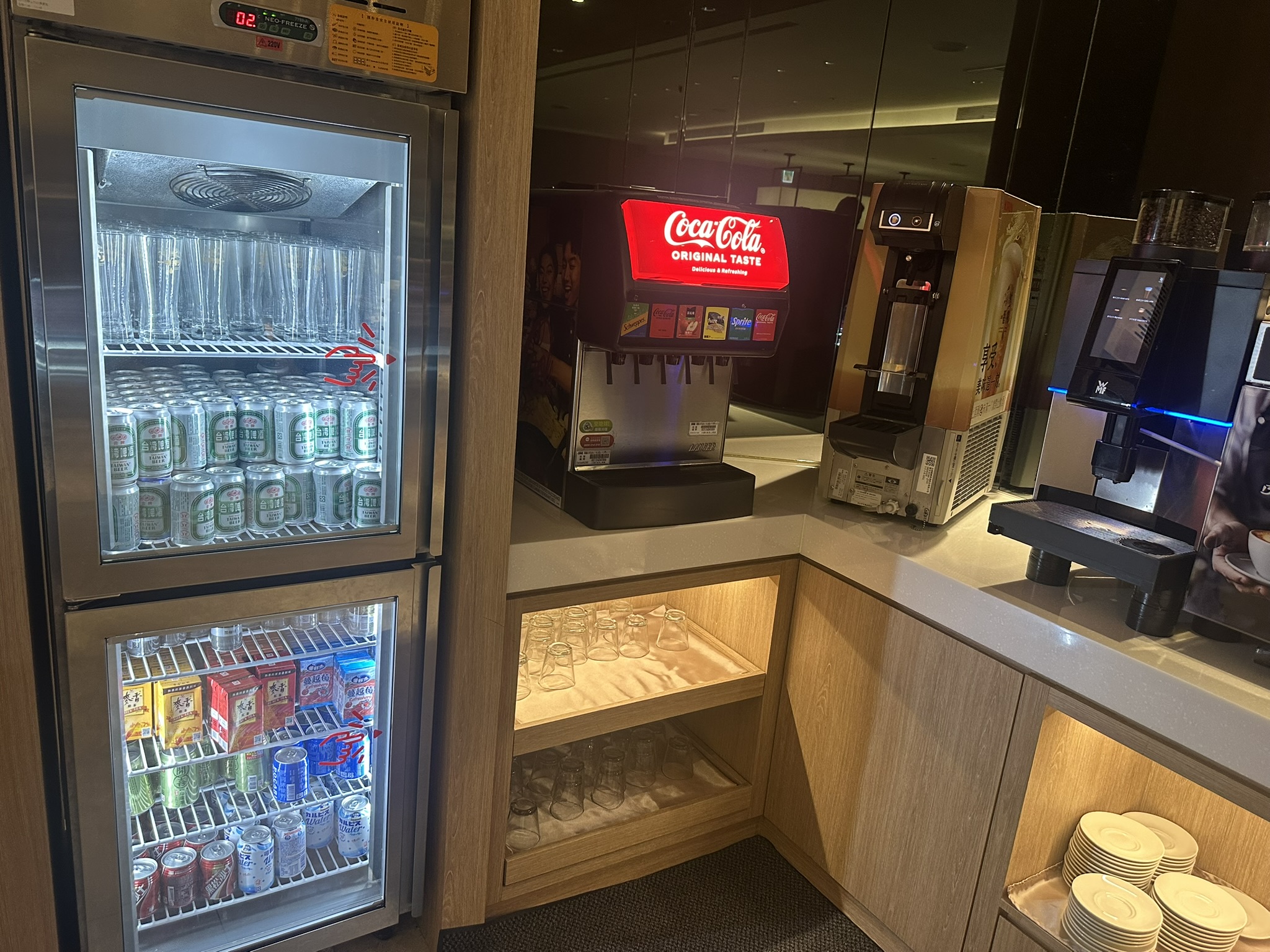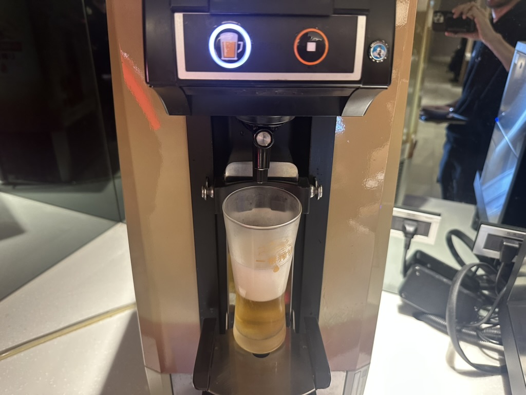 Darüber hinaus waren hier auch einige warme Optionen wie Dim Sum verfügbar. An einer Durchreiche zur Küche kann man weitere Speisen wie Suppe und Nudelgerichte zusammenstellen lassen und bestellen. Dazu wurde ein Bier von dem Zapfautomaten empfohlen.