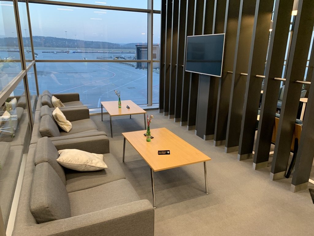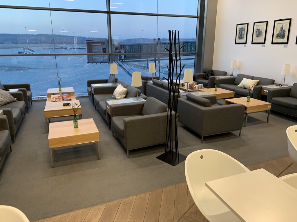 Die Lounge selbst ist in mehrere Bereiche unterteilt, hierfür verwendet man zur optischen Abgrenzung einige Raumtrenner. Kurz hinter dem Eingang und entlang der großen Fensterfront findet man eine Reihe von Sesseln in großen Sitzgruppen. Besonders das Tageslicht und der Blick auf das Vorfeld sind ein großer Vorteil der Lounge.