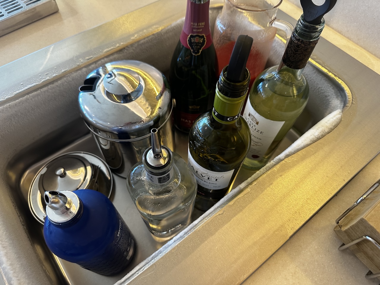 Zu dem Getränkesortiment gehören die üblichen Softdrinks und Heißgetränke. Es stehen aber auch Wein, Bier und Sekt und einige Spirituosen bereit.