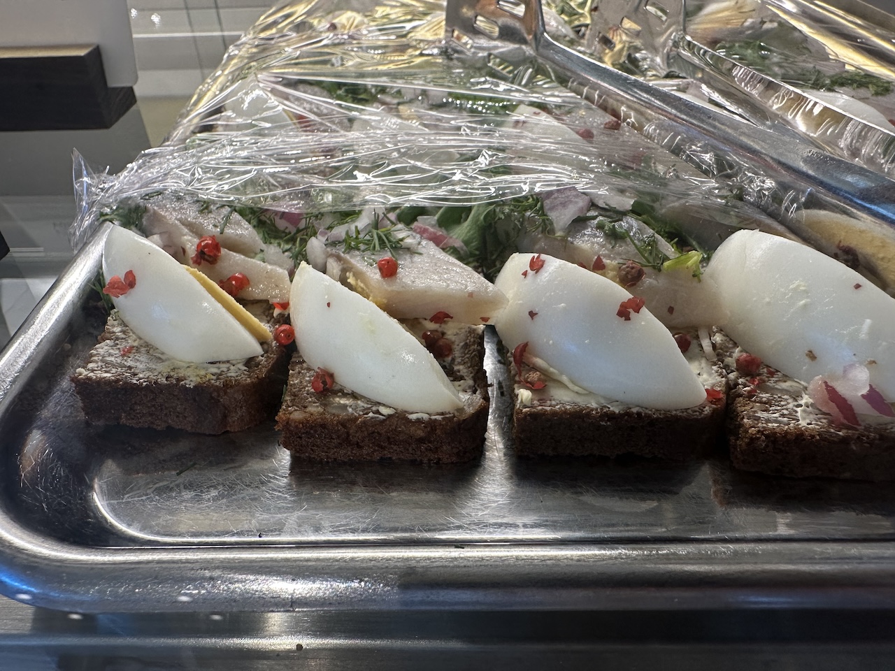 Es gab Salate, kleine Sandwiches, Käse und Obst. Vermutlich wird zu bestimmten Zeiten auch etwas Warmes aufgetischt, an diesem Morgen war die Küche aber (noch) kalt.