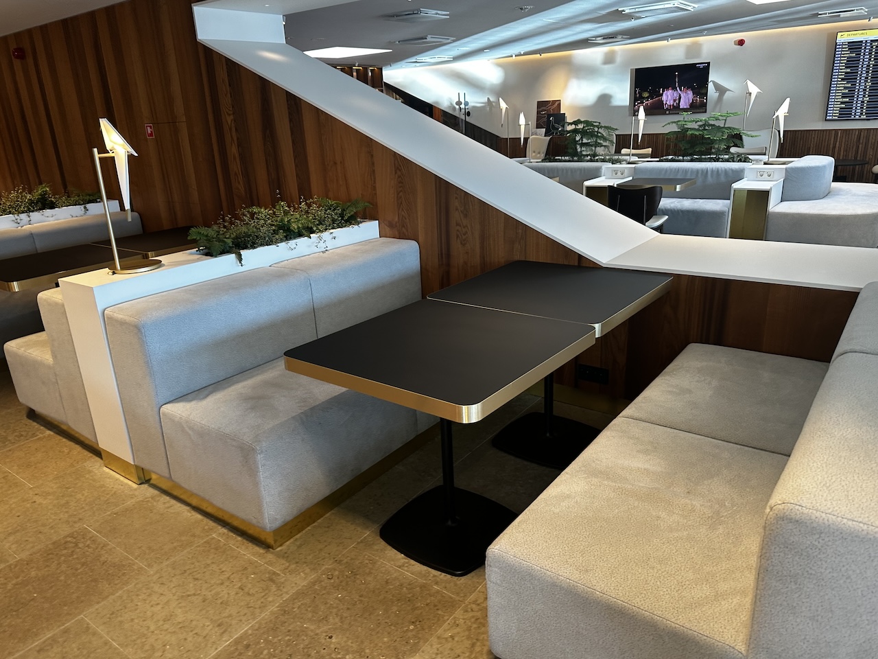 Die Lounge ist sehr modern eingerichtet und in mehrere Bereiche aufgeteilt. Ich war überrascht wie groß diese ist und wie viele verschiedene Sitzmöglichkeiten man bietet.