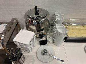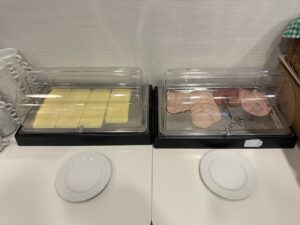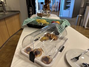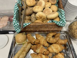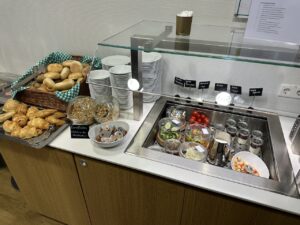 Das Angebot an Speisen war während meines Aufenthalts gegen Mittag eher überschaubar. Neben einer Auswahl an Brötchen, Croissants sowie etwas Aufschnitt gab es noch eine warme Suppe. In einem Kühlfach standen noch Salat und Nachspeisen.