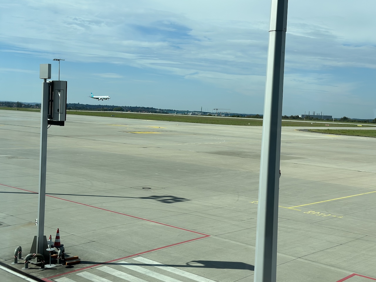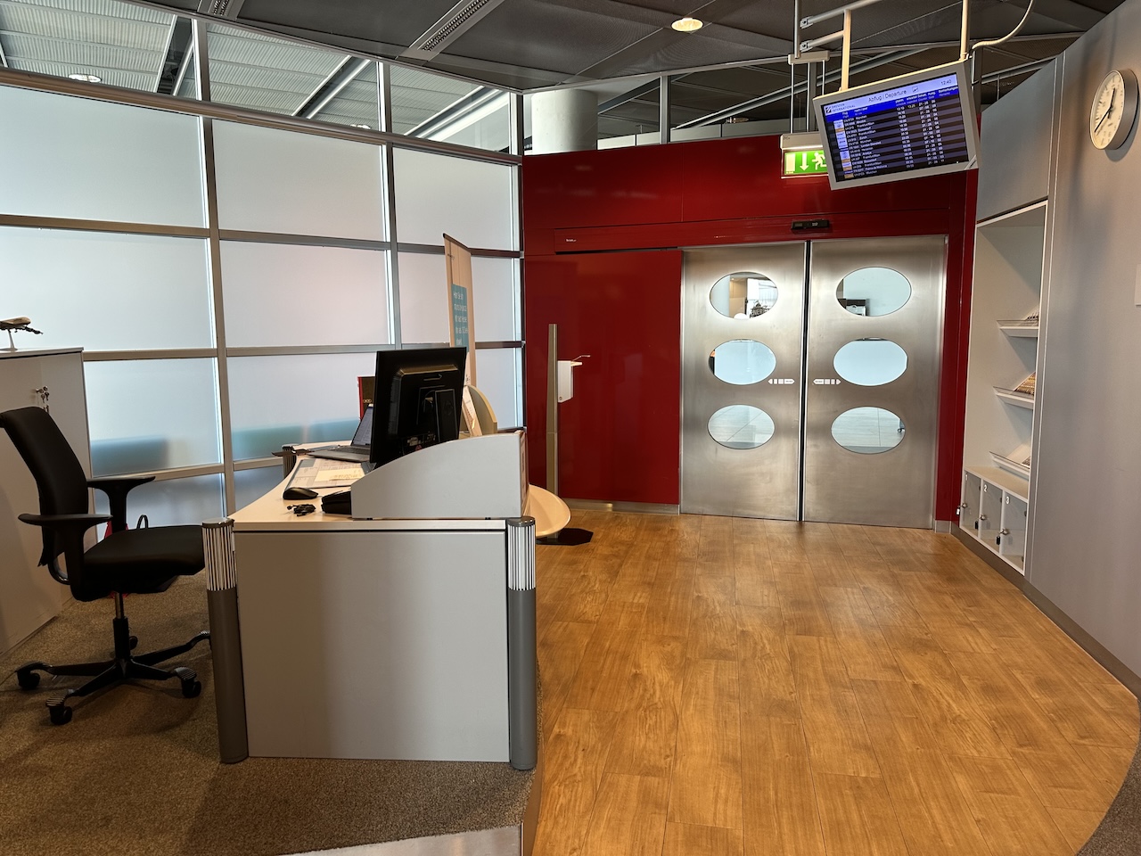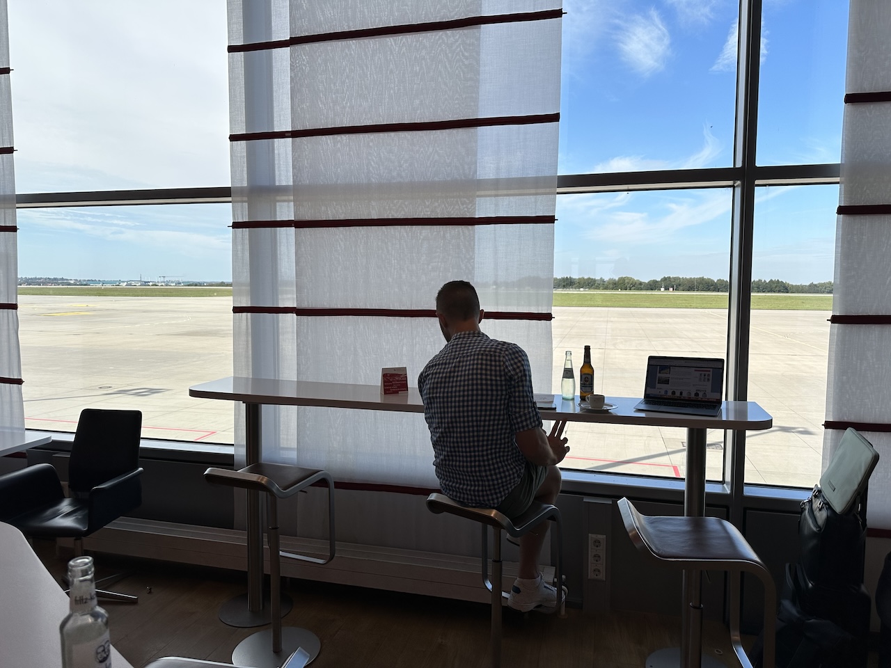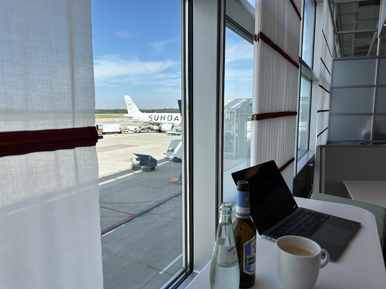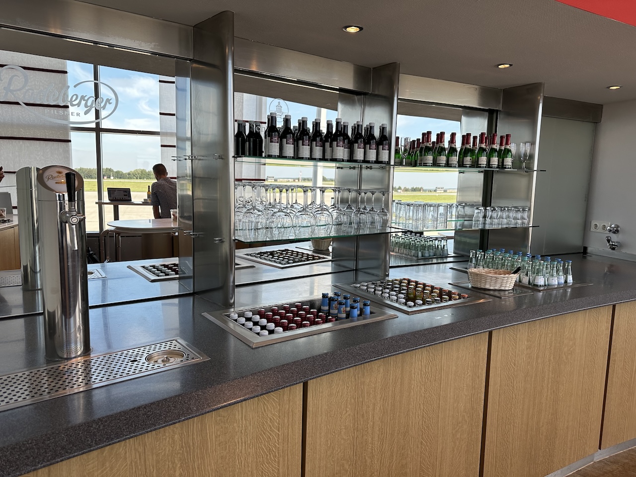 In der Regel ist an dem Regionalflughafen wenig los, dennoch ist ein Fenster mit Vorfeldblick immer ein Plus. Die räumliche Trennung vom öffentliche Bereich der Abflugebene verspricht zudem Ruhe, da auch keine Ansagen gemacht wurden.