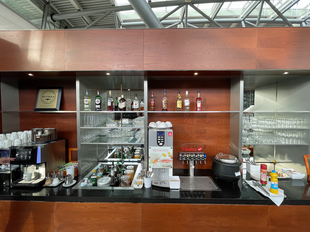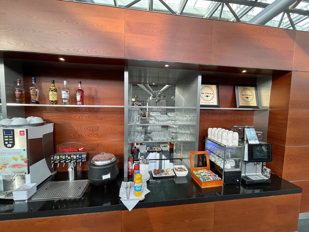 Hinter der Rezeption gelangt man in die Lounge, die sich dann ungefähr von der Fensterwand zum Vorfeld bis zum Geländer des Stockwerks erstreckt. Direkt hinter der Rezeption befindet sich der Hauptteil des Buffets. Dort gibt es einen Kaffeevollautomaten, heißes Wasser und Teebeutel, eine Zapfanlage für Softdrinks von Sinalco, einen Suppenautomaten sowie ein wenig Teegebäck. Außerdem befindet sich die kleine Spirituosenauswahl dort.