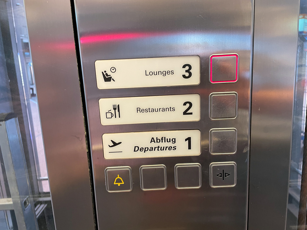 Stimmt. Statt nach rechts in die Airport Lounge, muss man nach der Fahrt im Aufzug links abbiegen. (s. Foto oben)