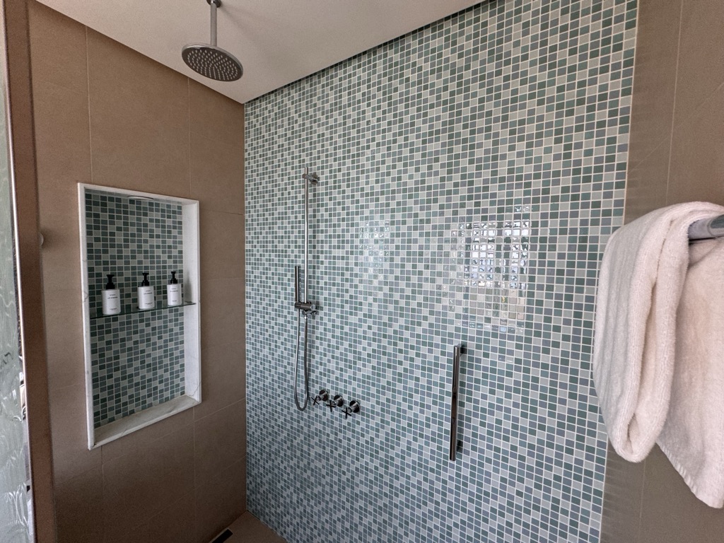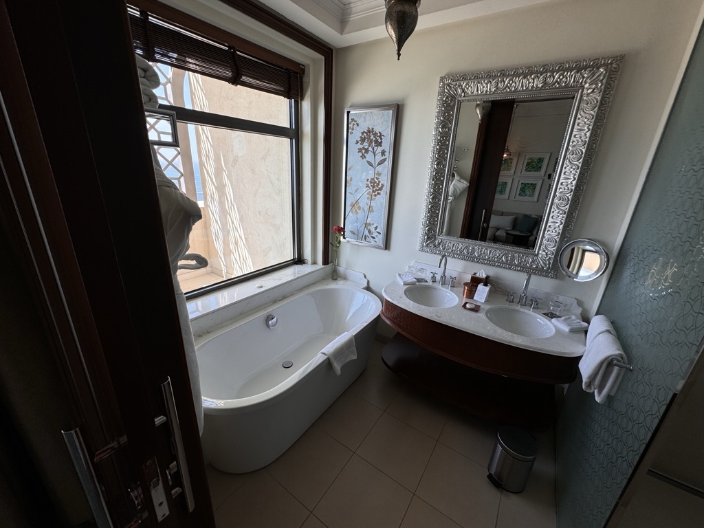 Das Bad ist am anderen Ende des Zimmers. Nicht besonders groß, aber super sauber und extrem hochwertig ausgestattet. Besonders gepunktet hat das Badezimmer mit dem schönen Meerblick aus der Badewanne.
