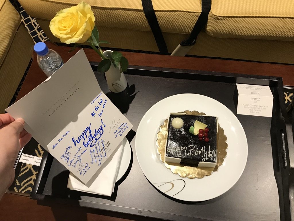 Als wir nach einem aufregenden Nachmittag auf dem Souq zurück in unser Zimmer kamen, erwartete mich eine kleine Torte auf dem Zimmer. Obwohl wir meinen Geburtstag nicht angekündigt hatten wurde er beachtet. Wir haben uns sehr über die Überraschung und vor allem die persönliche Karte mit den Unterschriften sehr gefreut.