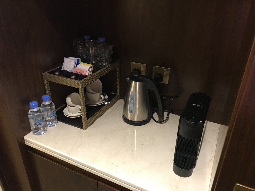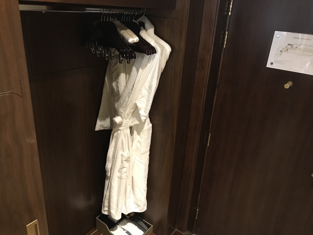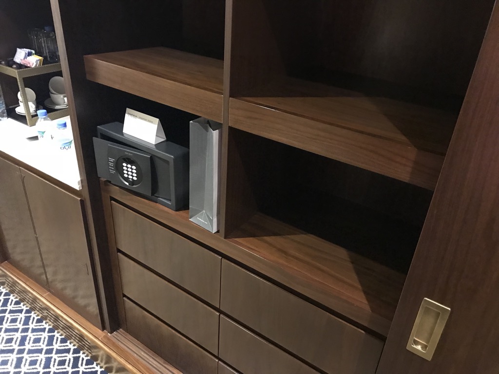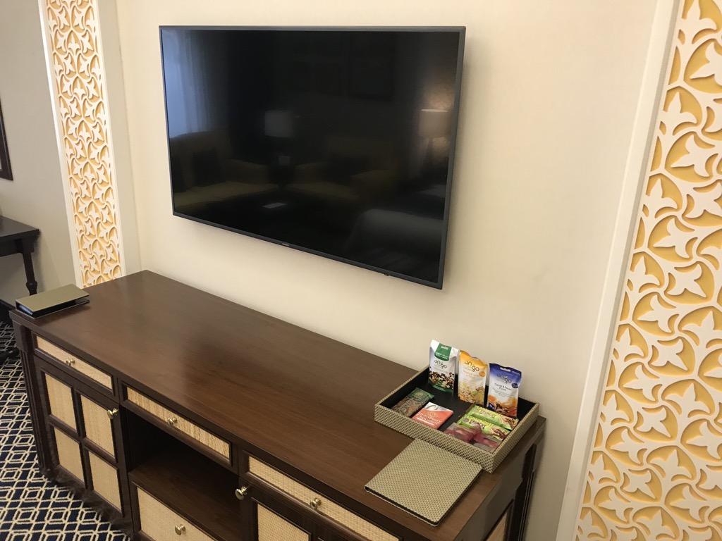 Gegenüber vom Bett befand sich eine Kommode mit großem Fernseher und den Snacks, die zur Minibar gehörten. Hier waren statt den üblichen M&Ms interessante Alternativen zu finden. Rechts neben der Kommode befand sich der Kleiderschrank inklusive der üblichen Ausstattung wie Safe, Hausschuhen, Bademäntel und Bügelbrett, sowie eine Tee- und Kaffeestation. In diesem Part des Zimmers war auch die bereits erwähnte „dry“ Minibar untergebracht.