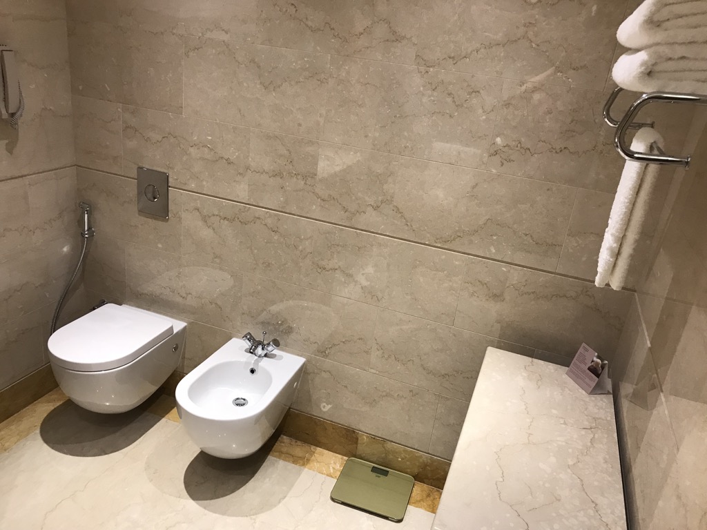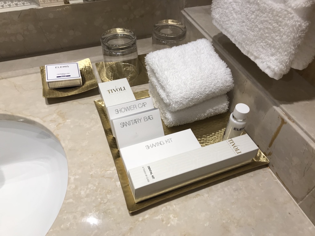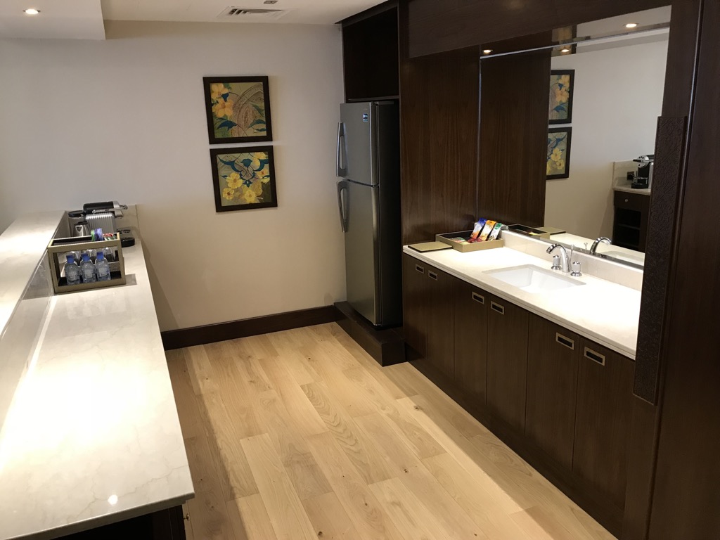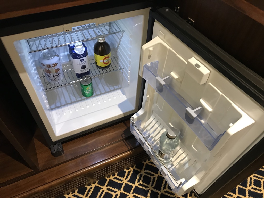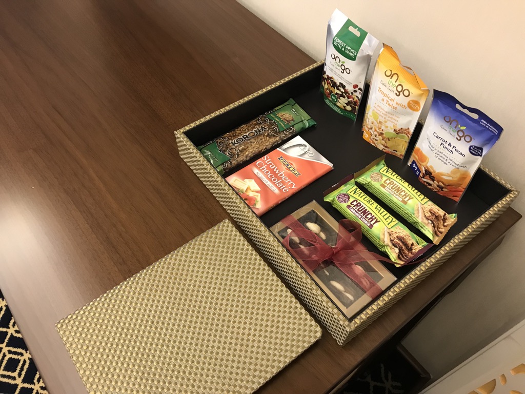 Gegenüber vom Bett befand sich eine Kommode mit großem Fernseher und den Snacks, die zur Minibar gehörten. Hier waren statt den üblichen M&Ms interessante Alternativen zu finden. Rechts neben der Kommode befand sich der Kleiderschrank inklusive der üblichen Ausstattung wie Safe, Hausschuhen, Bademäntel und Bügelbrett, sowie eine Tee- und Kaffeestation. In diesem Part des Zimmers war auch die bereits erwähnte „dry“ Minibar untergebracht.
