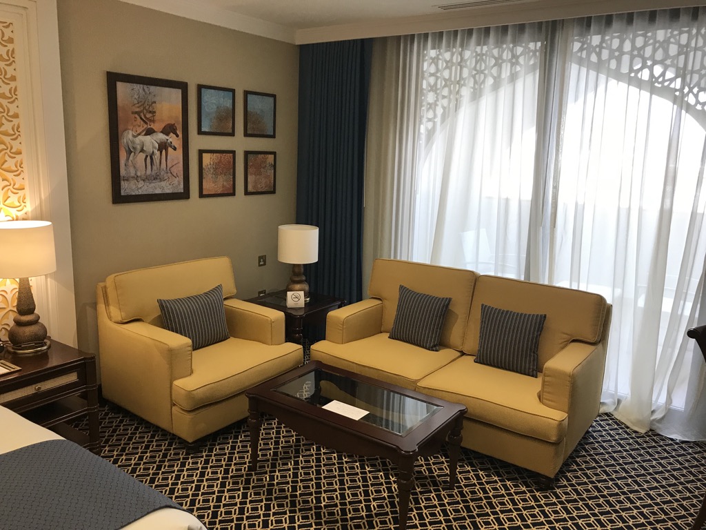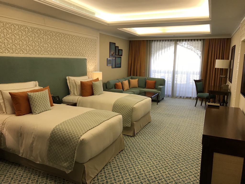 Im Zimmer angekommen wurde und das Zimmer, die Klimaanlage und auch die Minibar erklärt und vorgestellt. Das komplette Hotel mit allen Einrichtungen war sehr klar in einem durchgängigen geschmackvollen arabischen Stil gehalten, welcher uns sehr gefallen hat. Dieser Stil war auch bei der Minibar zu finden, denn es war eine „dry“ Minibar, welche nur Wasser, Säfte und Softdrinks enthielt. Dies stellte für uns absolut kein Problem dar. Ich trinke sowieso so gut wie nie Alkohol und es schadet ja auch niemandem sonst ein paar Tage darauf zu verzichten. Nun aber zurück zum Zimmer.