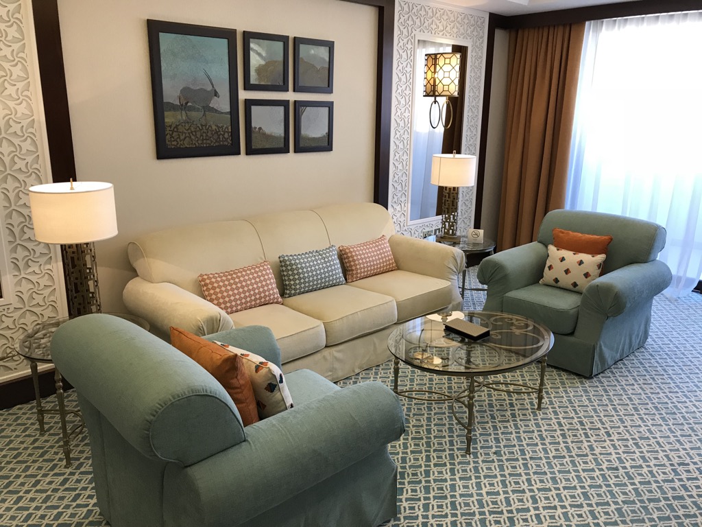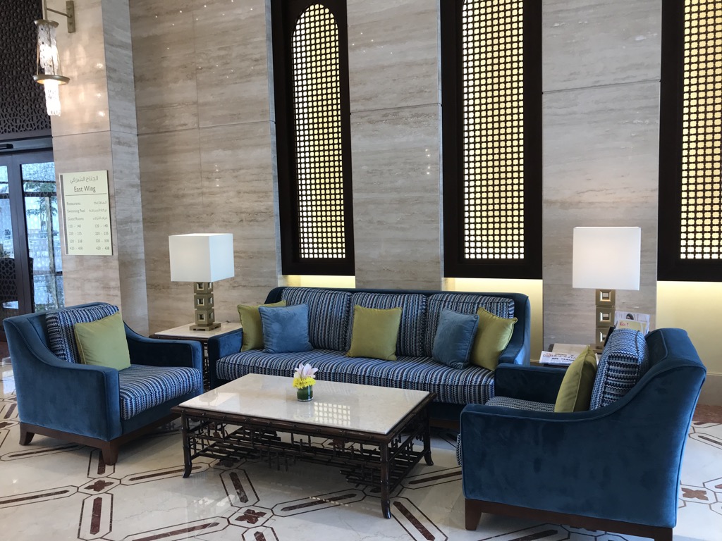 Kaum eingetreten, waren wir erst einmal sehr beeindruckt von der Lobby. Schon hier fiel uns auf, dass der arabische Stil sehr gelungen und lückenlos umgesetzt wurde. Die Lobby war sehr großzügig, modern, gemütlich und hell gestaltet.