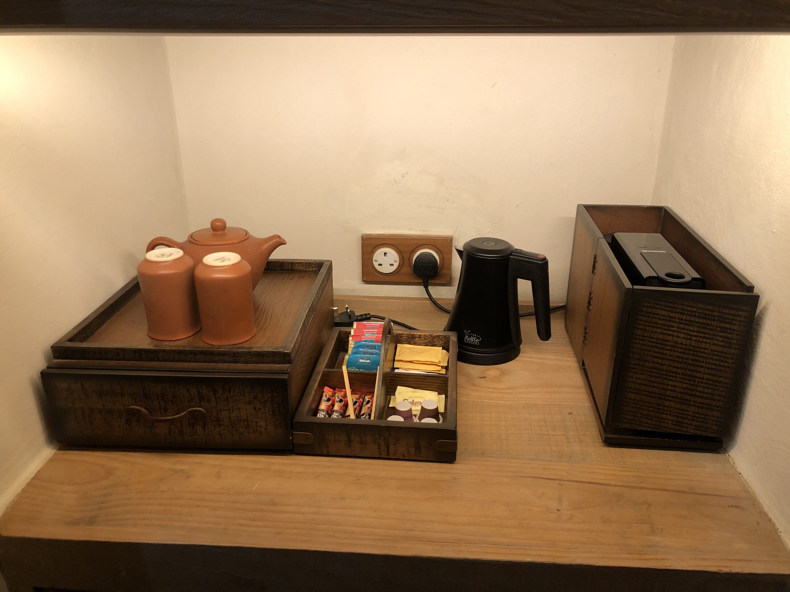 Im Zimmer stehen Espressomaschine, Wasserkocher, Kühlschrank und weitere Annehmlichkeiten bereit.