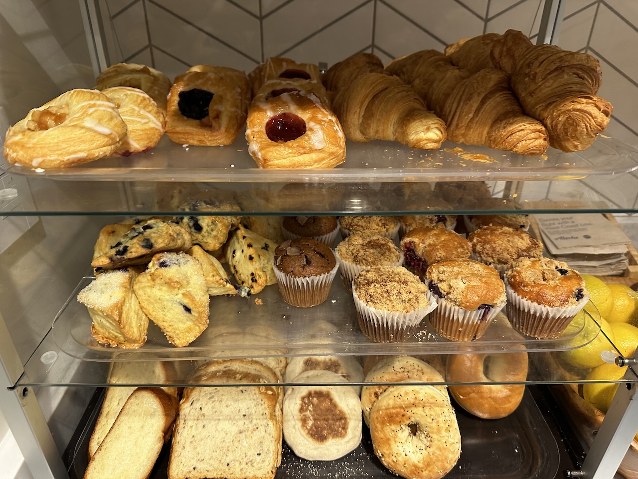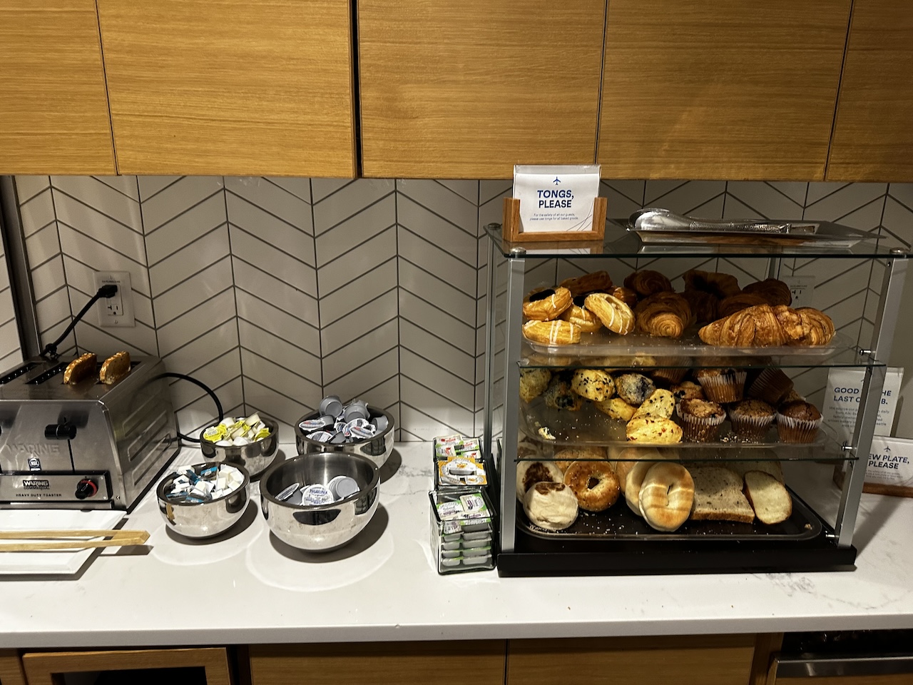 An beiden Buffets standen Gebäck wie Croissants, Muffins, Plunder, Bagels und Toast. Dazu konnte man sich mit Aufstrich, Aufschnitt, Gemüse und gekochten Eiern versorgen. Joghurt, Milch und Müsli waren auch da.