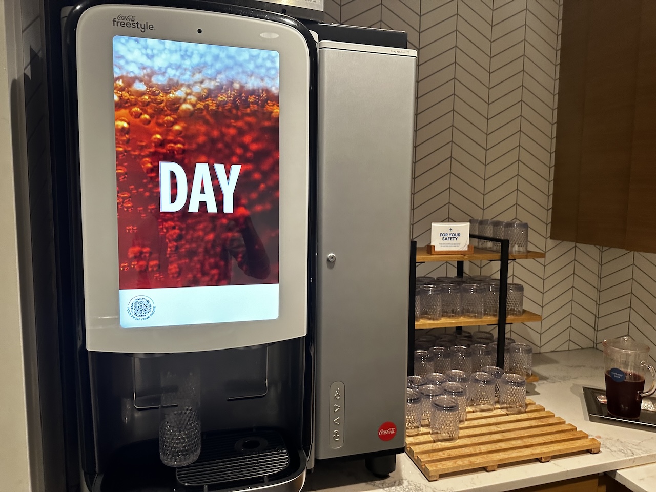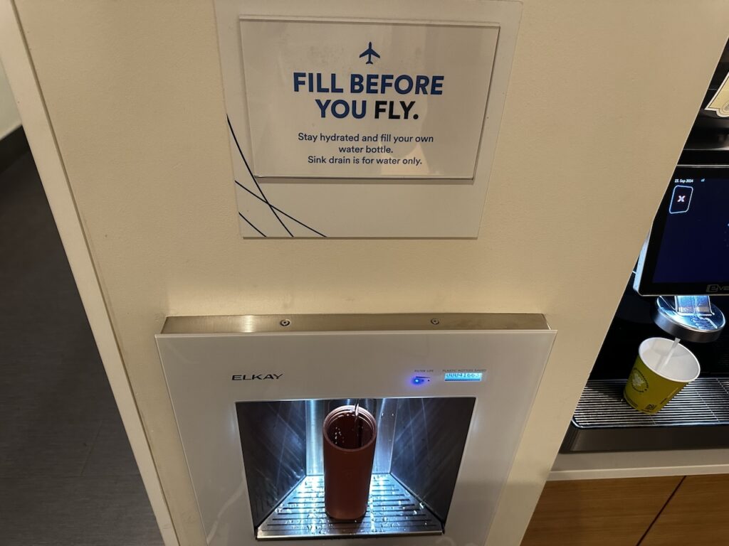 Den Kaffee bekommt man auf Wunsch in einer Tasse, wer nicht viel Zeit hat, darf diesen „to go“ bestellen und im Pappbecher mit ins Terminal nehmen. In den USA wird es in der Regel akzeptiert, wenn man bestimmte Dinge aus der Lounge mitnimmt. Apropos: Am Ausgang steht eine Auffüllstation für Wasserflaschen und Trinkbehältnisse.