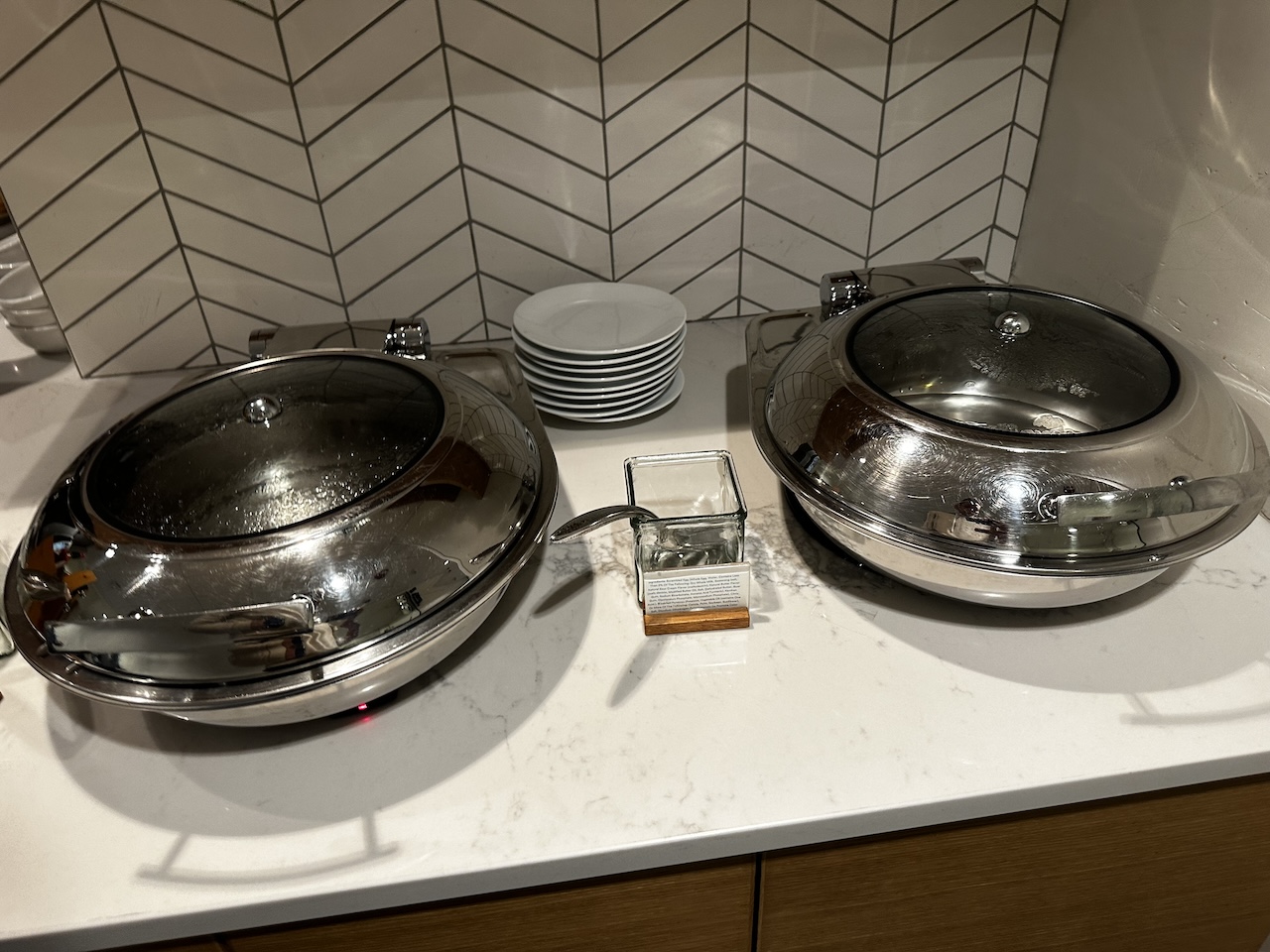 Die beiden Warmhalteschüsseln waren leider leer. Vermutlich wird hier erst zum Lunch oder Dinner etwas bereitgestellt, die Küche war am Morgen jedenfalls kalt.