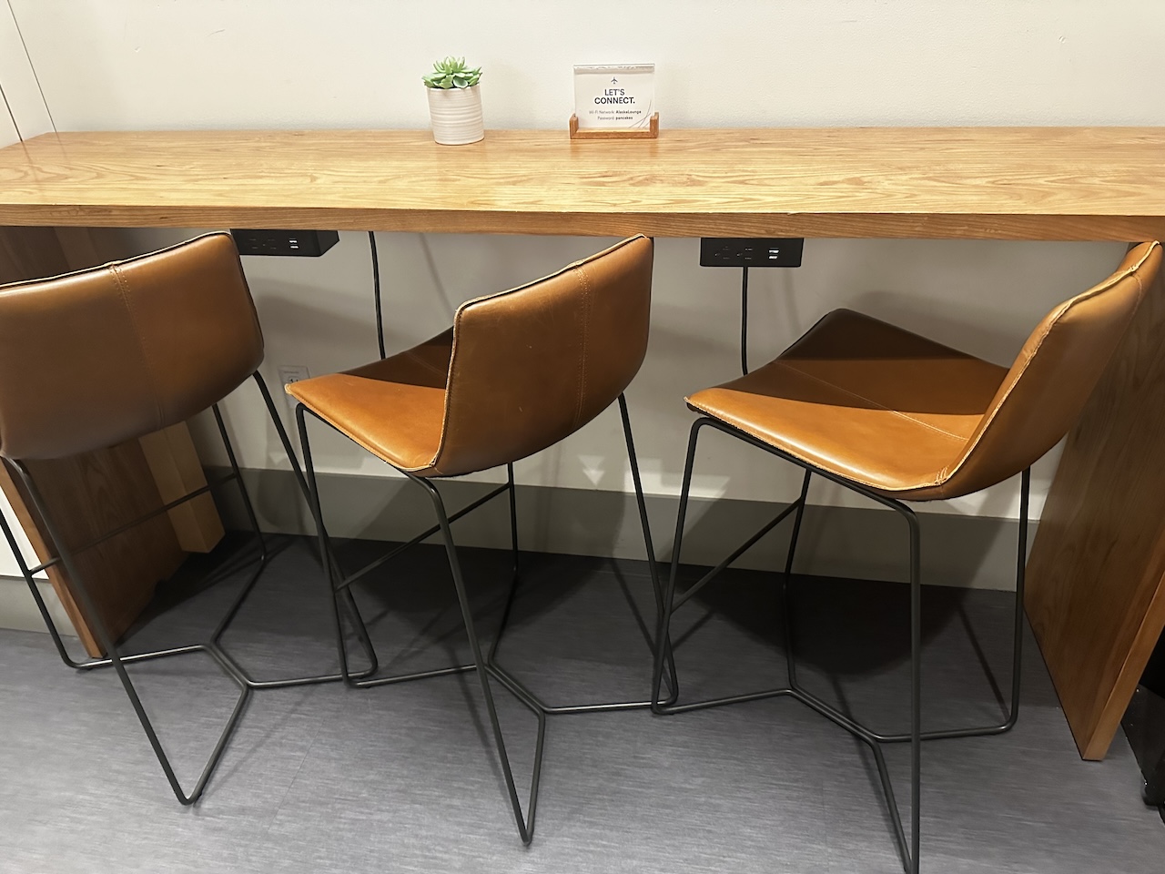 An allen Sesseln, Stühlen, Hockern und Sofas sind Stromanschlüsse. Der Aufenthaltsraum ist sehr wohnlich gestalten und gemütlich eingerichtet. Die Farben sind eher warm, das Interieur modern.