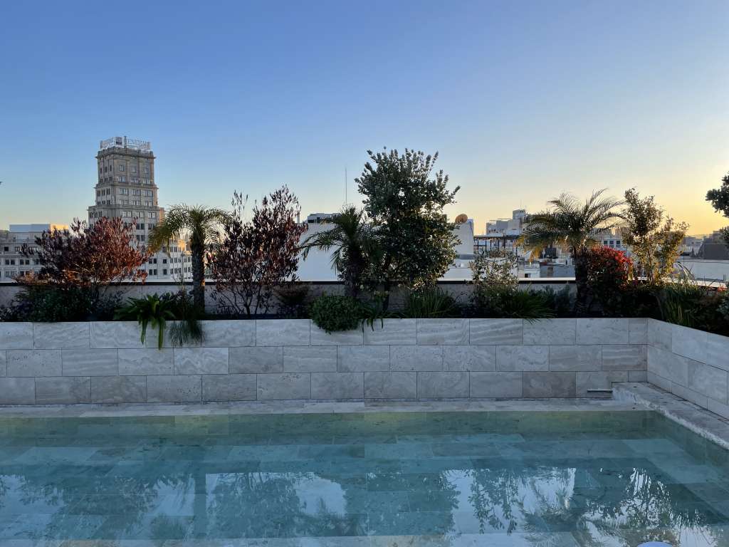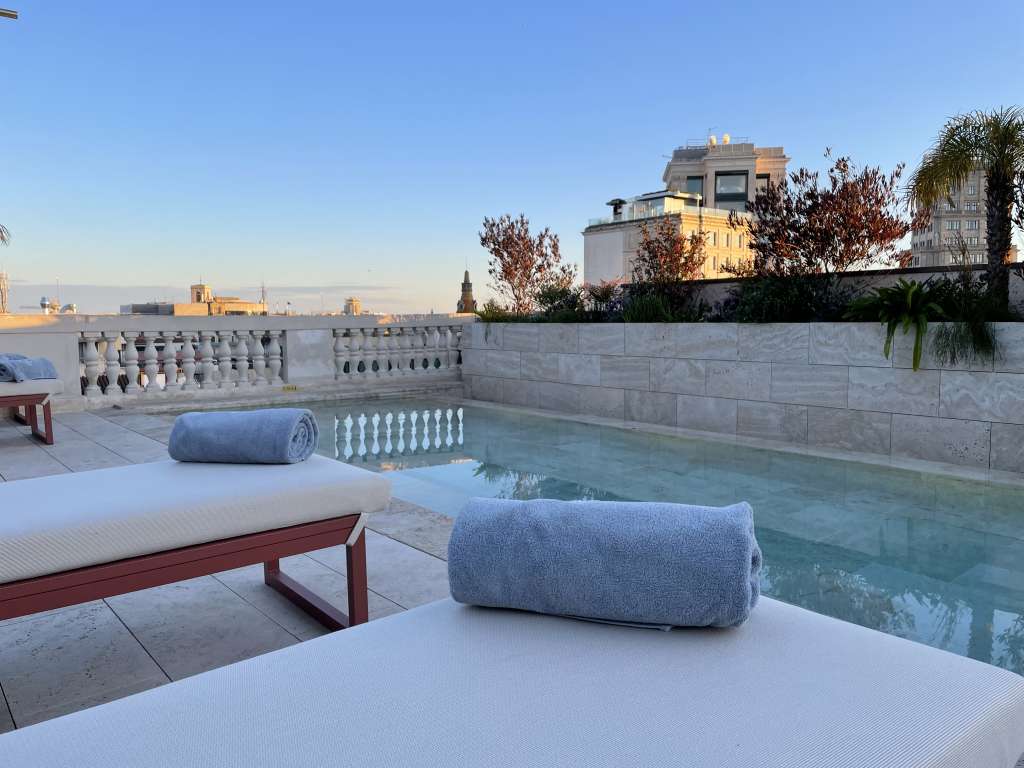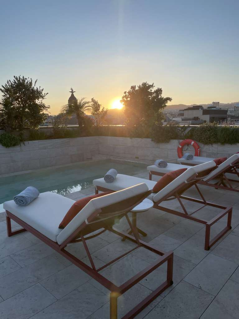 Perfekt in Szene gesetzt wird der Pool auf der Dachterrasse. Nicht viel mehr als ein Planschbecken, reicht er für eine kühle Erfrischung nach einem heißen Tag in Barcelona oder für einen Sundowner zum Abschluss eines ereignisreichen Tages. Dank der angrenzenden Azimuth Bar ist für Drinks und Snacks jederzeit gesorgt.