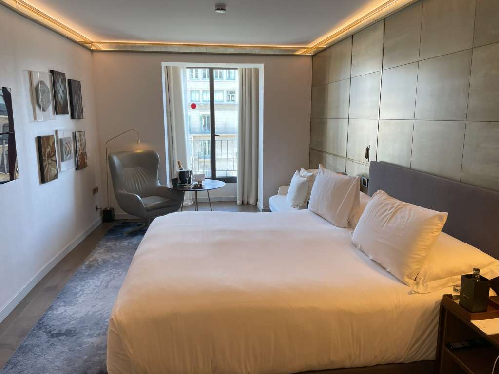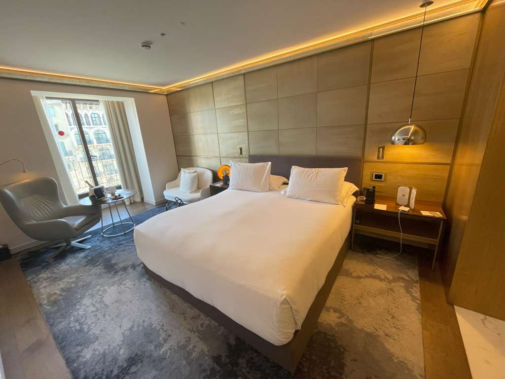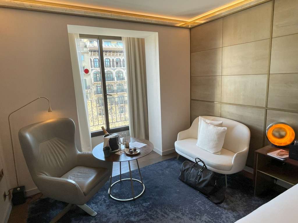 Die „Almanac Room“-Kategorie des Almanac Hotels Barcelona besticht durch ein modernes, elegantes Design, das meiner Meinung nach Komfort und Stil perfekt vereint. Der Raum ist hell und luftig gestaltet, mit großen Fenstern, die viel Tageslicht hereinlassen und einen schönen Blick auf Barcelona ermöglichen. Die Einrichtung präsentiert sich in zeitgenössischem Stil mit einer harmonischen Farbpalette aus Beige, Grau und Weiß, die eine ruhige und einladende Atmosphäre schafft. Hochwertige Materialien wie der Holzfußboden und die stilvolle Marmorverkleidung an der Wand hinter dem Bett verleihen dem Zimmer eine luxuriöse Note.