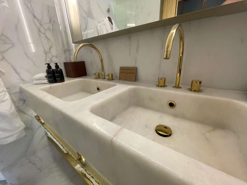Das Badezimmer setzt das elegante und luxuriöse Design fort. Es ist vollständig mit weißem Marmor ausgekleidet, der sowohl an den Wänden als auch auf dem Boden für ein edles und sauberes Erscheinungsbild sorgt. Ein großes Doppelwaschbecken aus Marmor mit goldenen Armaturen dominiert den Raum und bietet ausreichend Platz für zwei Personen.