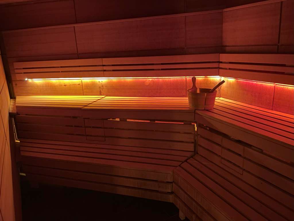 Sauna und Ruheraum müssen laut Hotelwebsite vorab gebucht werden. Ich hatte noch ein paar Dinge am Empfang zu erledigen und fragte, ob der Bereich bereits geöffnet sei. Die Mitarbeiterin bejahte das, wollte sich aber nochmals vergewissern. Die Viertelstunde, die ich noch auf dem Zimmer verbrachte, reichte genau aus, um die Sauna auf Temperatur zu bringen.