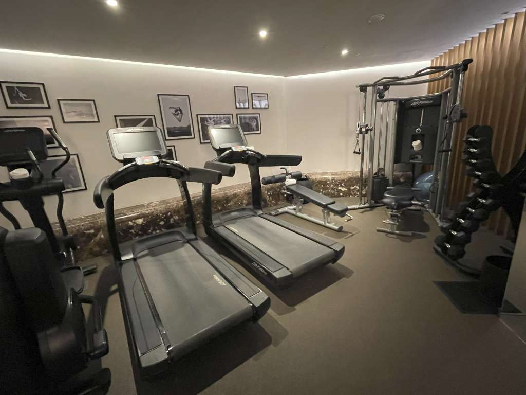 Der Fitnessbereich des Almanac Hotels Barcelona hat mich zunächst etwas verwirrt. Früh morgens stand ich vor verschlossener Glastür. Der Raum schien größer, als er später beim Betreten war. Eine Spiegelwand, die direkt an den gläsernen Eingang grenzte, vermittelte diesen täuschenden Eindruck. Ausgestattet ist der Fitnessraum mit zwei Laufbändern, einem Stepper und Geräten zum Krafttraining. Alles sehr komprimiert zusammengestellt. Selbst ein Wasserspender hat in der hinteren Ecke, etwas versteckt, Platz gefunden.