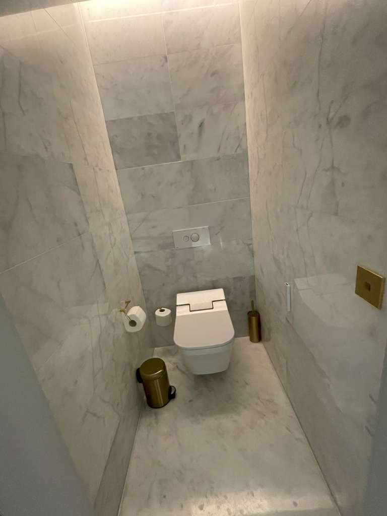 Ein separater WC-Bereich ist ebenfalls in Marmor gehalten und verfügt über ein modernes WC, wie man es vornehmlich in Japan kennt. Leider war die Fernbedienung für die Heiz- und Wasserduchfluss-Funktionen der Toilette, die in einer Halterung an der Wand arretiert war, ohne Funktion.