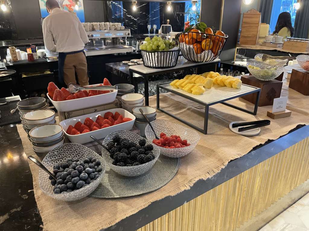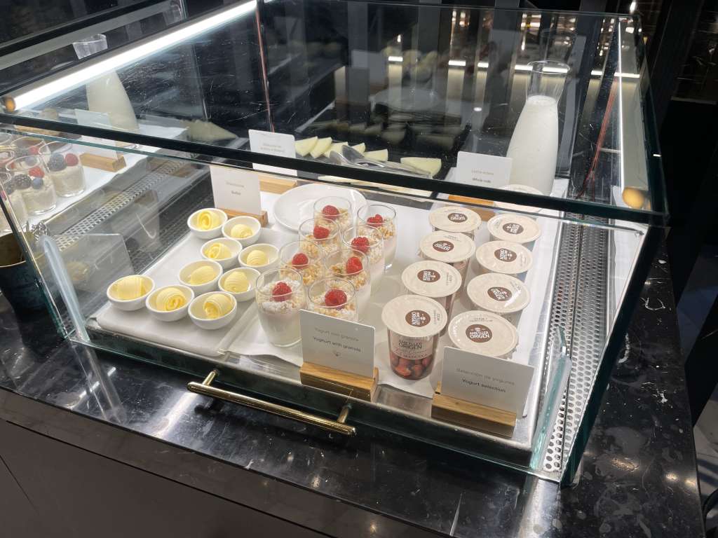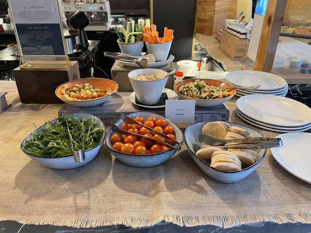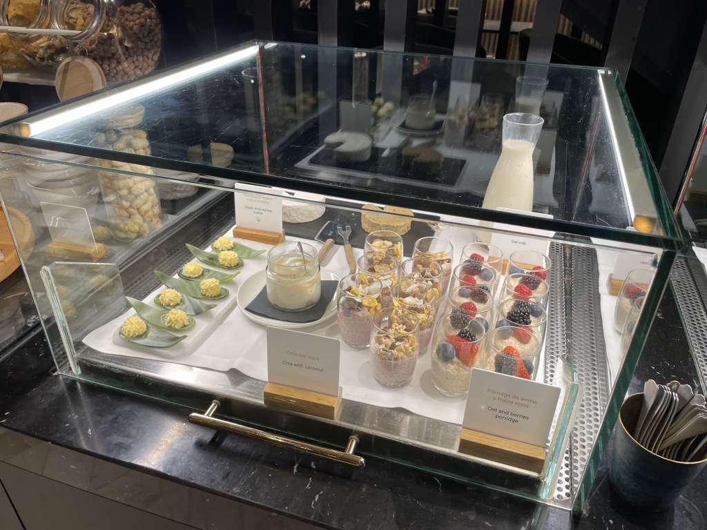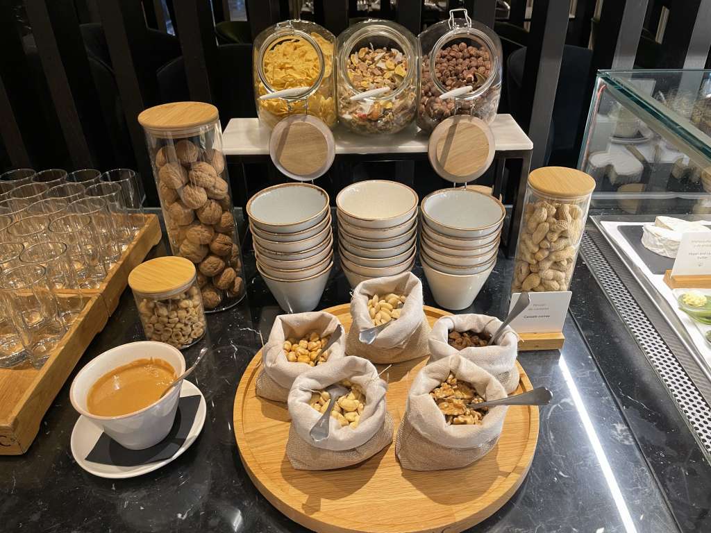 Eine Ecke mit Müslis ergänzte das Angebot ebenso wie Käse und Joghurt. Vergeblich suchte ich am Buffet jedoch Wurstaufschnitt. Selbst die Klassiker, wie Iberico oder spanische Salami, fehlten. Die gab es jedoch, wenn man sich aus der Karte warme Gerichte, beispielsweise Eggs Benedict, bestellte.