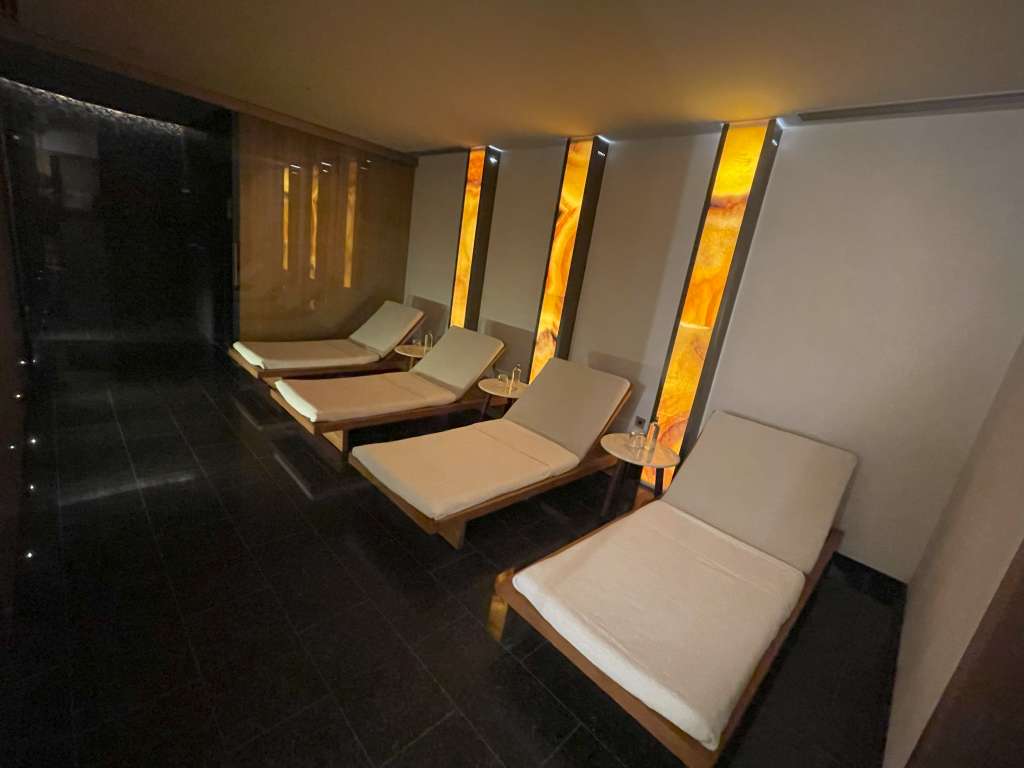 Links neben dem Fitnessbereich befindet sich eine Sauna mit vorgelagertem Ruheraum. Auch Anwendungen können im Hotel gebucht werden. Dafür steht noch ein angrenzender Behandlungsraum zur Verfügung. Der fensterlose Ruheraum wird stimmungsvoll beleuchtet und erwartet Wellnessliebhaber perfekt vorbereitet mit Handtüchern auf den Liegen und einer Flasche Wasser auf dem Beistelltisch.