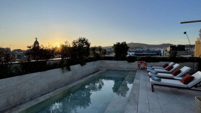 Perfekt in Szene gesetzt wird der Pool auf der Dachterrasse. Nicht viel mehr als ein Planschbecken, reicht er für eine kühle Erfrischung nach einem heißen Tag in Barcelona oder für einen Sundowner zum Abschluss eines ereignisreichen Tages. Dank der angrenzenden Azimuth Bar ist für Drinks und Snacks jederzeit gesorgt.
