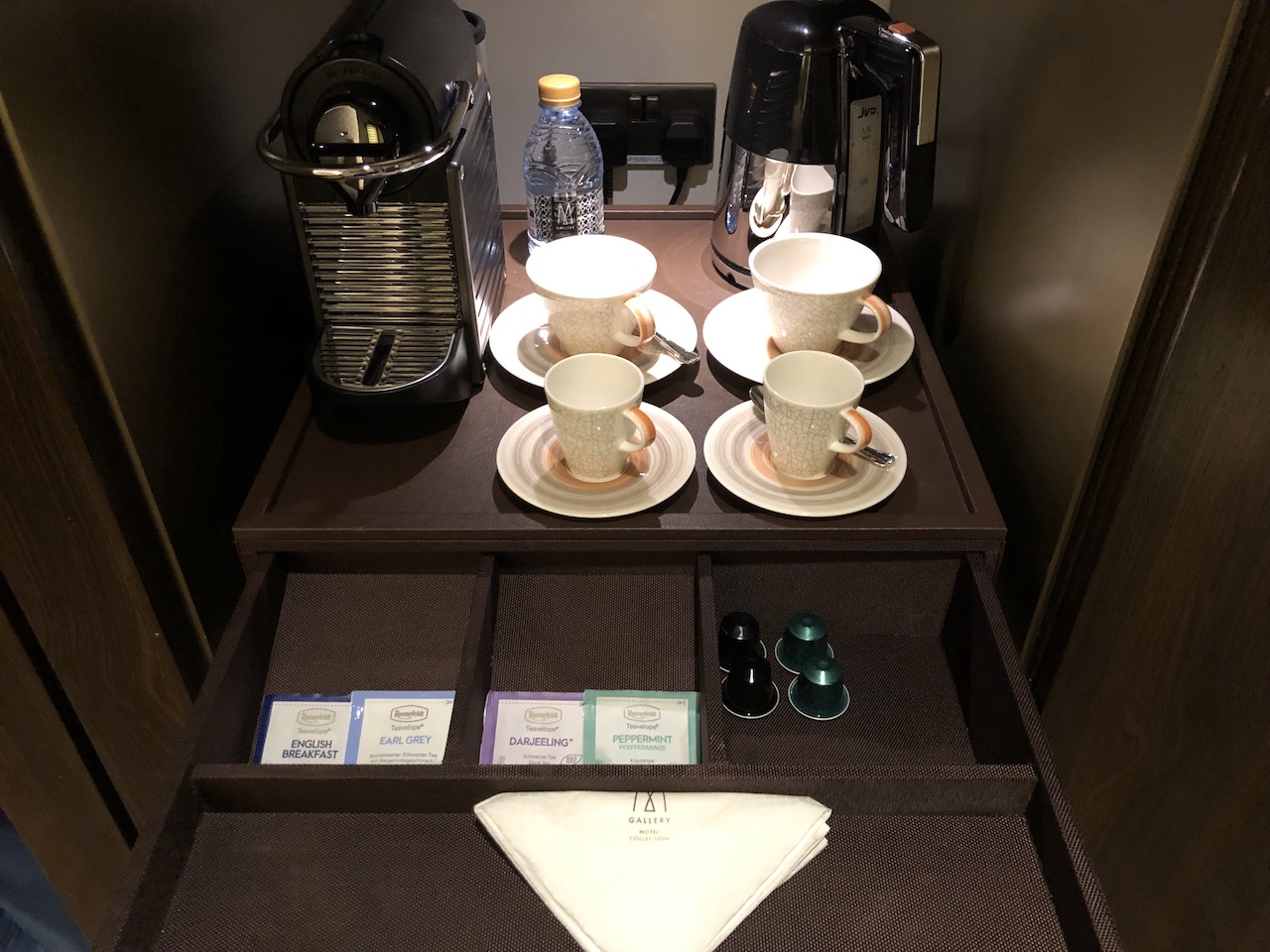 Zahlreiche Steckdosen und Lademöglichkeiten sind an mehreren Stellen installiert, es stehen u.a. Safe, Kühlschrank und Espressomaschine bereit.