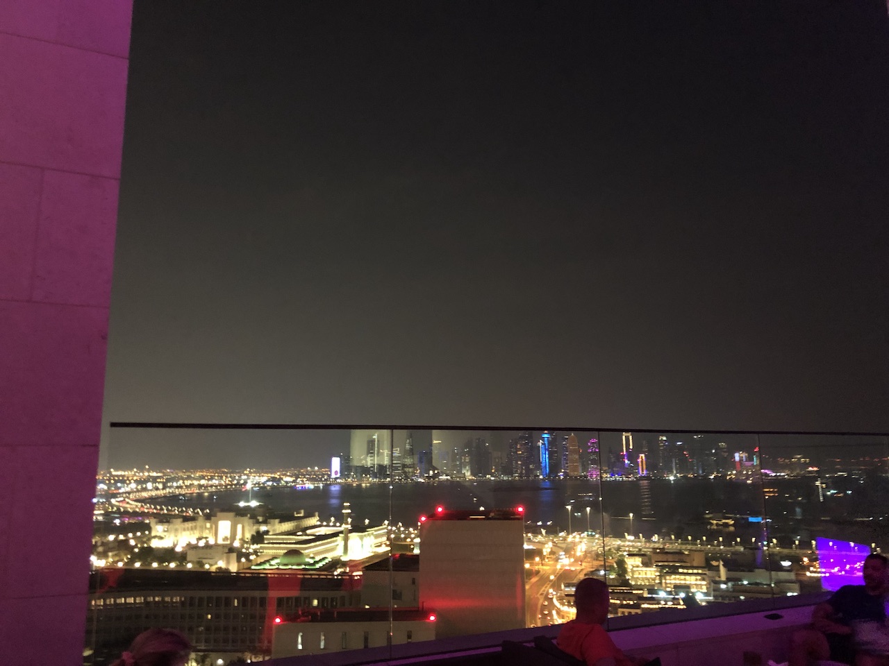 In der 20 Etage ist eine Rooftopbar die eine gute Aussicht sowie eine schöne Brise bietet. Die Preise sind gehoben, Doha ist aber generell kein günstiges Pflaster.
