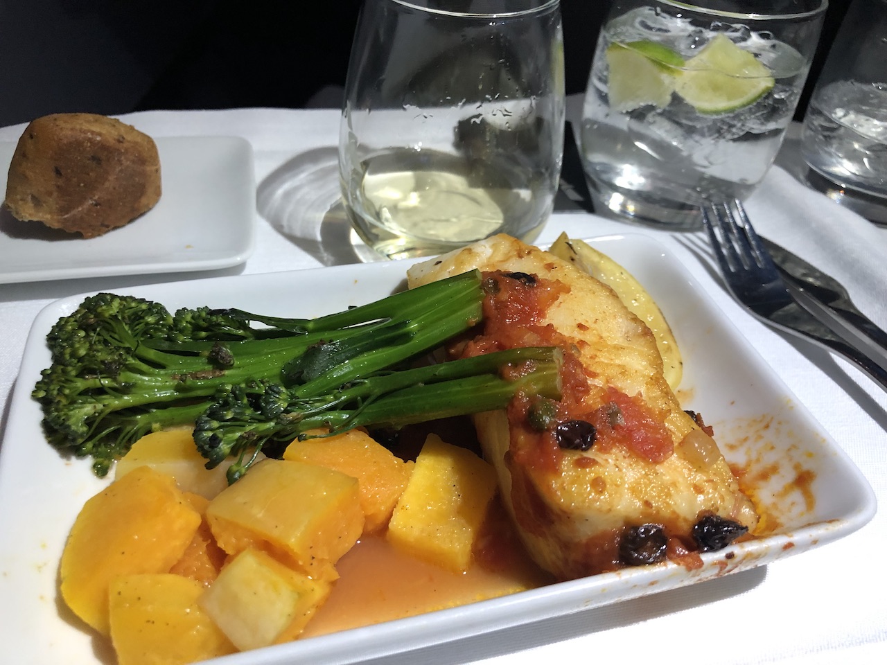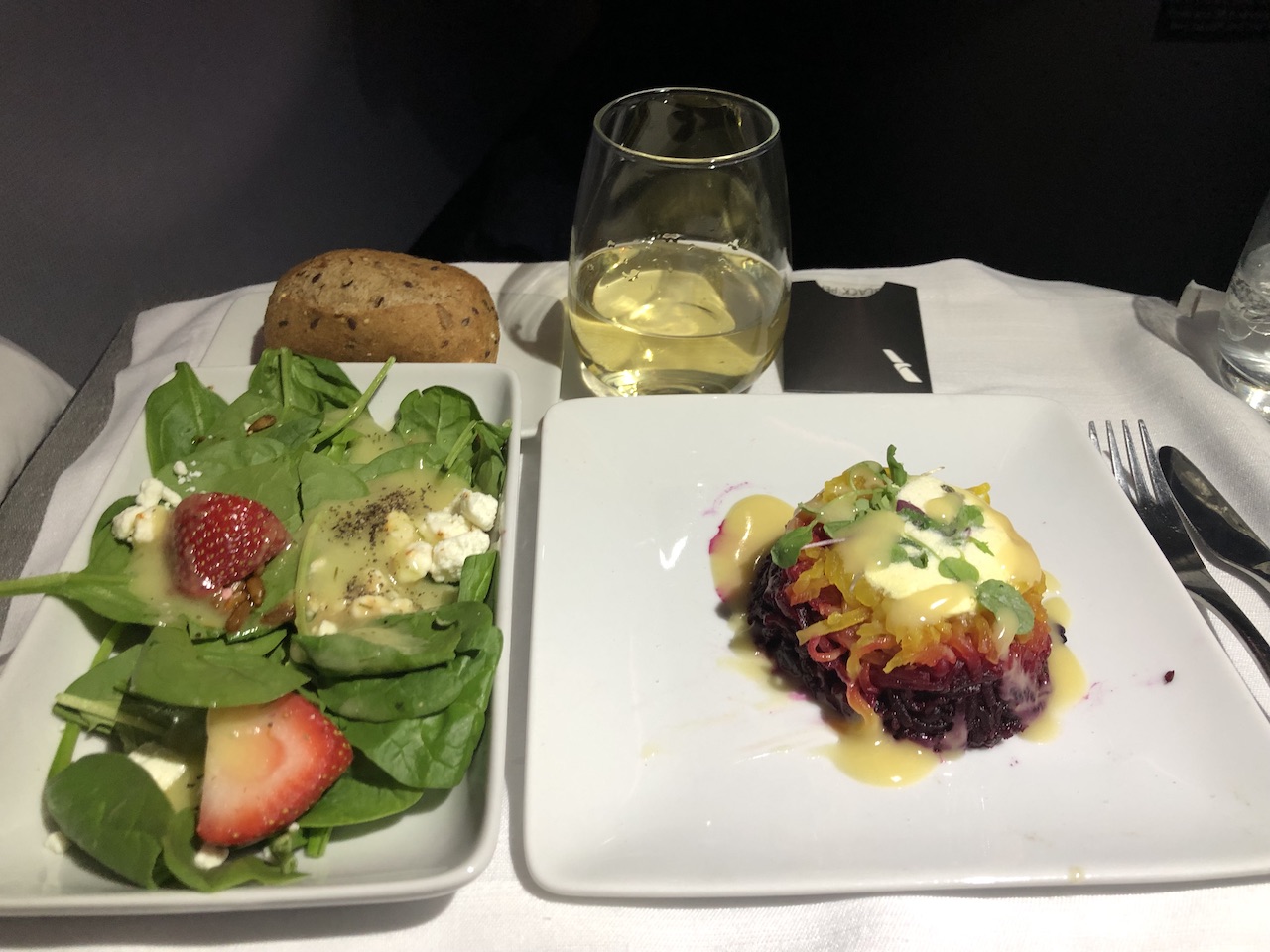 Die Mahlzeiten lassen sich bis zum Tag vor dem Abflug online reservieren, bei vier verschiedenen Hauptgerichten kann eine oder zwei Optionen schnell vergriffen sein. Die Favoriten wurden noch am Boden abgefragt, in der Luft wurden zunächst Getränke serviert.