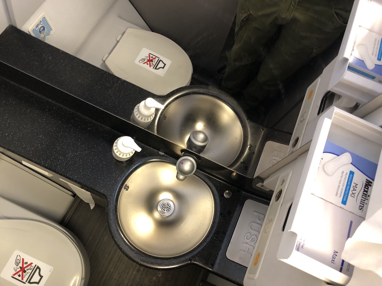 An den Sitzen lagen Kopfhörer von Bang & Olufsen, Decke, Kissen, Amenity Kit & Wasserflasche. Auf den Jets stehen insgesamt vier Waschräume zur Verfügung, ein guter Schnitt für nur maximal 102 Passagiere.