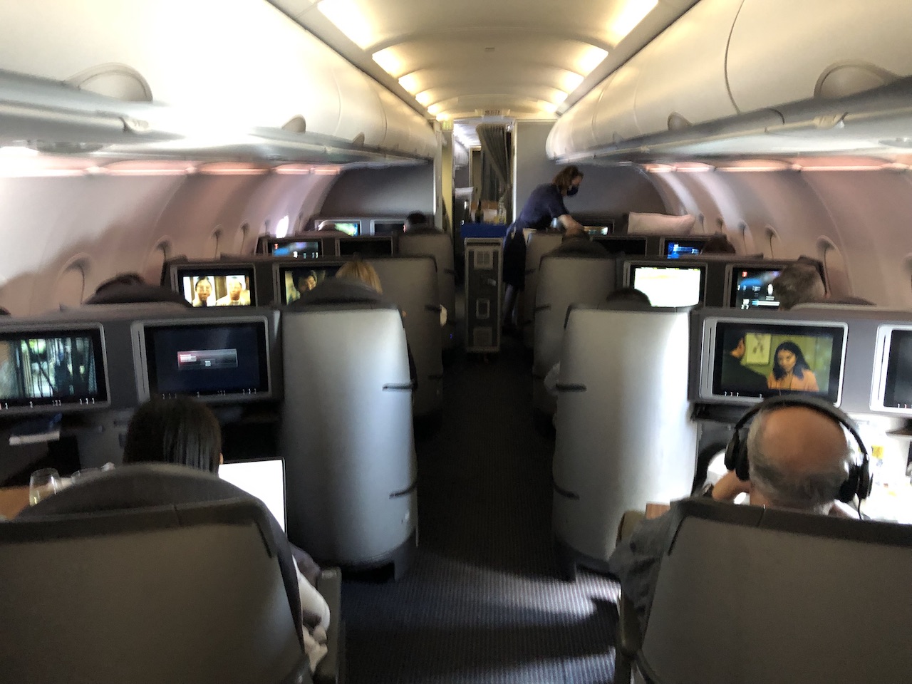 Die Sitze lassen sich elektrisch verstellen, man kann auch flach liegen und so einen Nachtflug gut verbringen. Die meisten Flüge in Richtung Osten finden über Nacht statt, aber auch sonst lassen sich so die 5-6 Stunden langen Reisen bequem bewältigen.