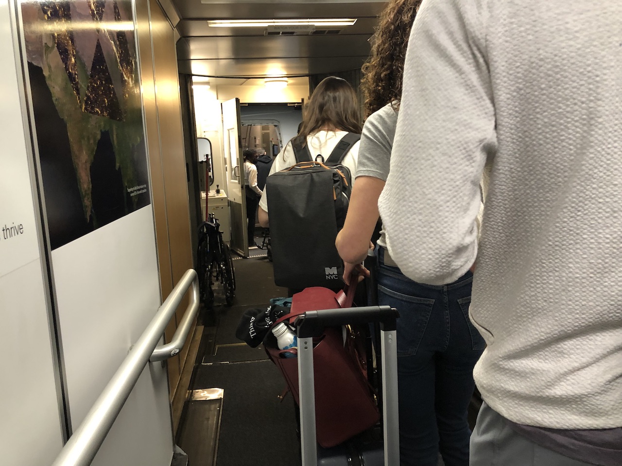 Das Boarding ging pünktlich los und lief geordnet ab, die Warteliste war wie auf fast allen US-Flügen lange. Mitarbeiter und Angehörige sowie Statuskunden mussten sich für einen freien Platz bzw. ein Upgrade noch etwas gedulden während das Pre-Boarding u.a. für Passagiere mit eingeschränkter Mobilität oder Soldaten startete.
