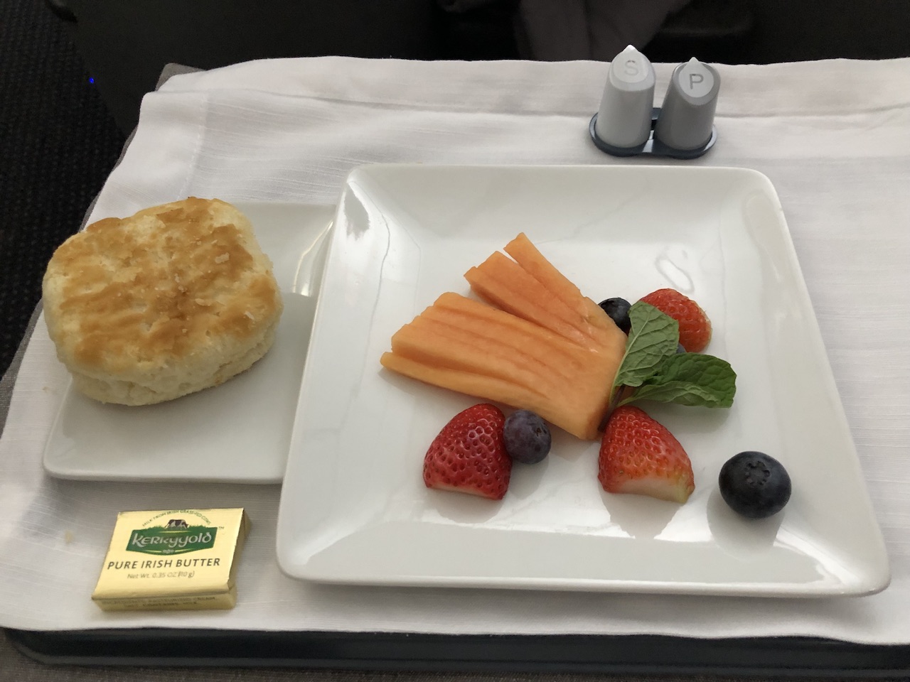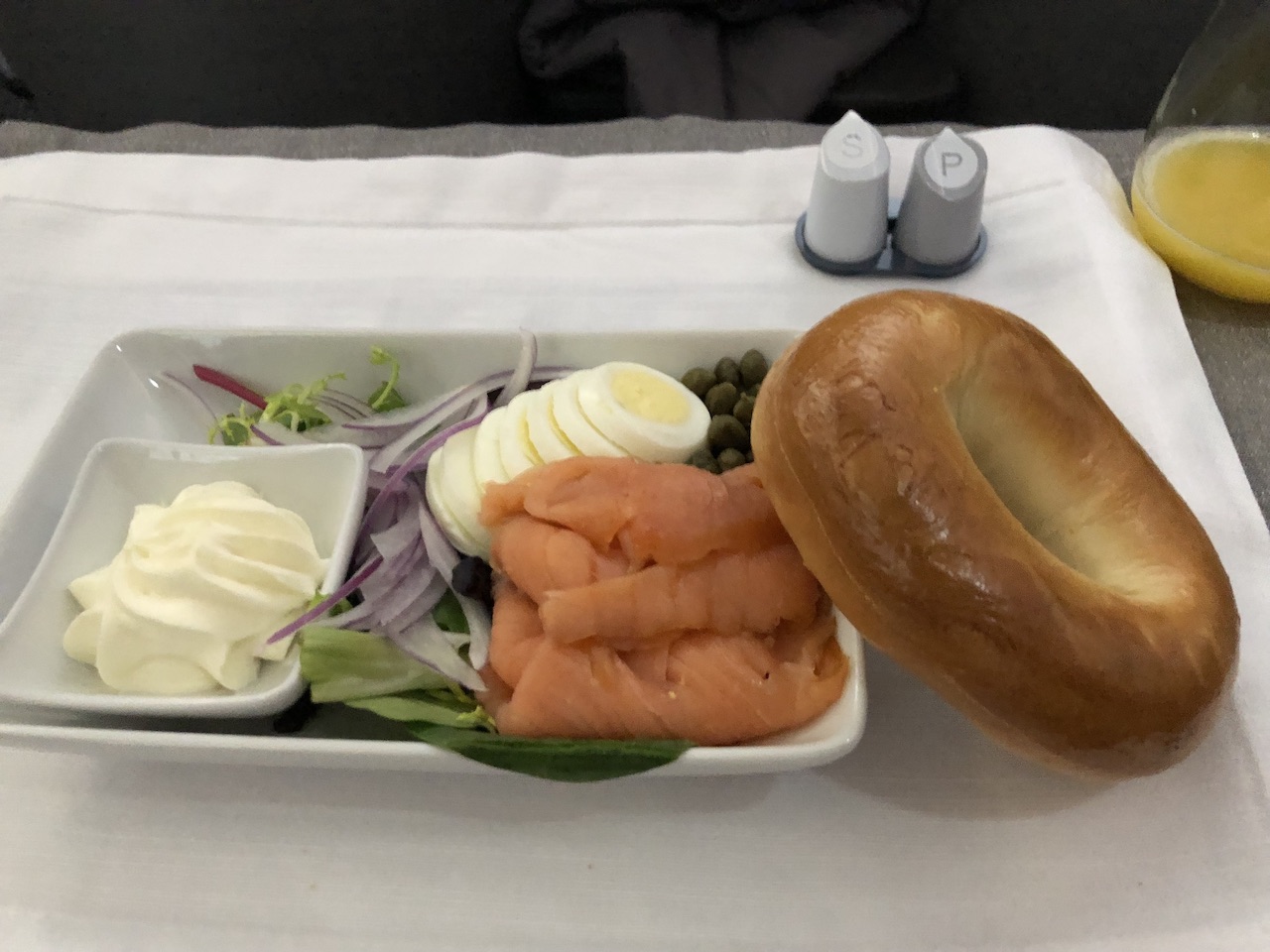 Sowohl morgens als auch abends gab es Vorspeisen (Obstteller bzw. Salat) und die Hauptspeisen (Fisch & Lachs-Bagel). Als Dessert wurden Eiscreme oder Käse gebracht- dafür war ich aber leider viel zu satt. In der Bordküche standen Snackkörbe bereit, die Flugbegleiter sind damit auch durch die Kabine. Gegen Ende der Flüge wurden warme Schokoladenkekse gereicht.