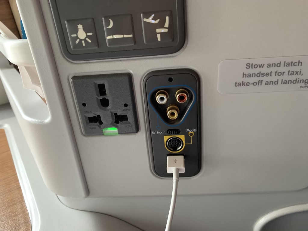 Direkt neben dem Sitz auf Schulterhöhe befinden sich alle Einstellknöpfe, die Fernbedienung für das Entertainmentsystem und ein USB Anschluss sowie eine Steckdose und eine Leselampe.