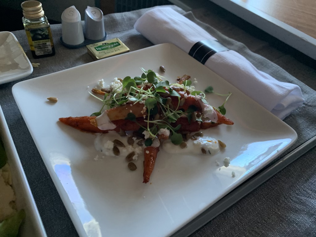 Die Vorspeise mit „gerösteten Karotten und Schafskäse“ war überraschend gut und auch den Salat konnte man essen. Nachdem ich z.B. auf dem Flug von London nach Dallas noch fast das komplette Essen habe zurück gehen lassen, war das Catering ab Los Angeles durchaus gut.