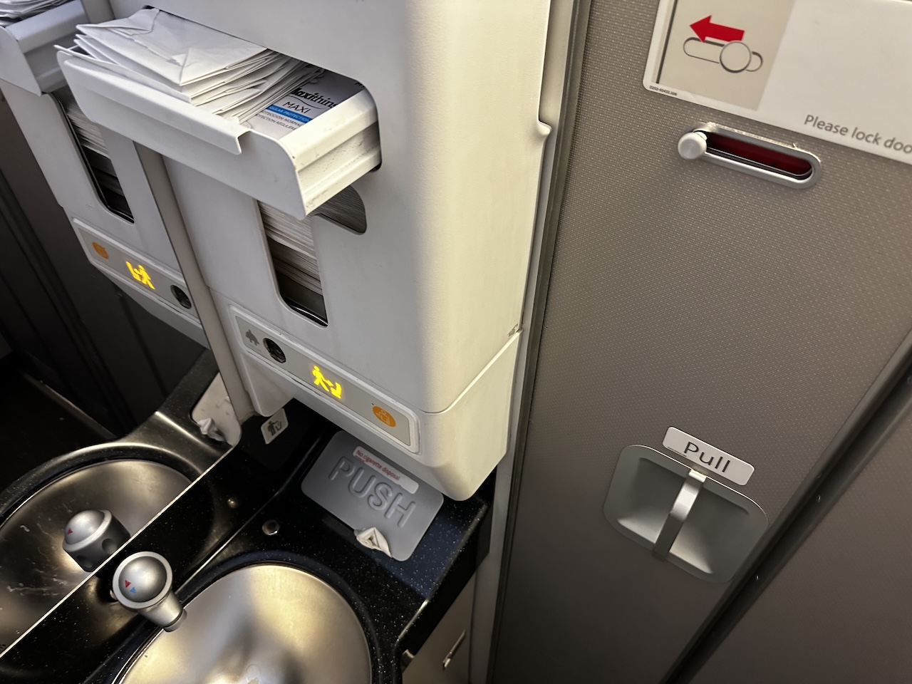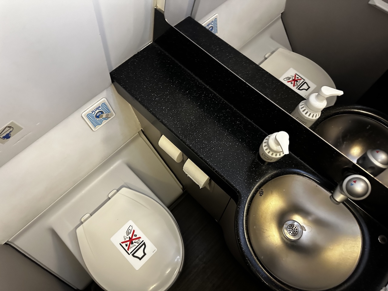 Die Sitze sind leicht versetzt und sehr bequem, hier kann man auch ganz gut die Nachtflüge verbringen, die es zwischen der Ost- und Westküste gibt. Die 20 Passagiere der Business Class haben auch einen eigenen Waschraum.