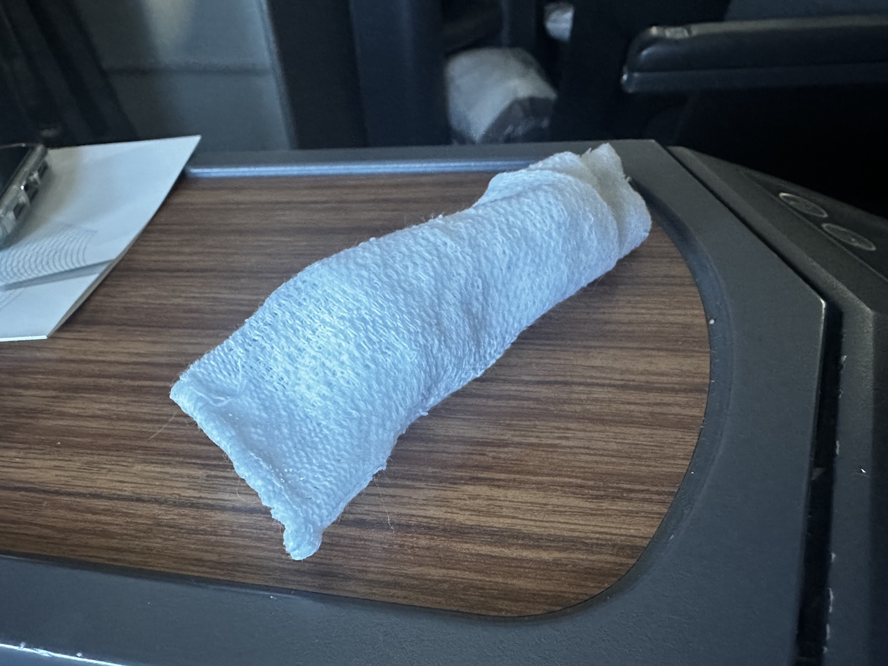 Am Boden geht es mit einem Welcomedrink los, nach dem Start kommen heiße Tücher und ein Aperitif mit Nüssen.