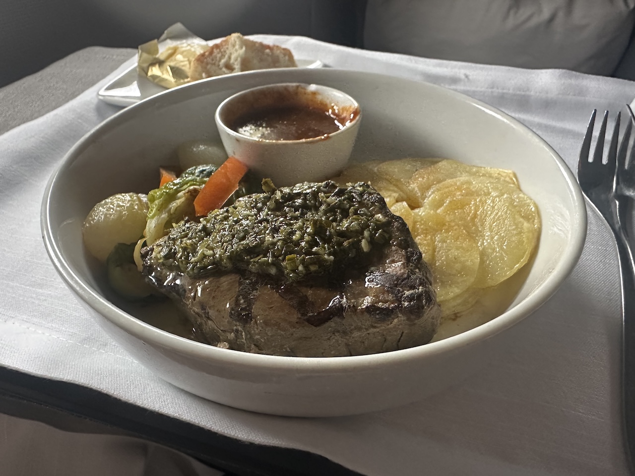 Nach einem Aperitif gibt es Vorspeise und Salat, danach kann man aus vier Hauptgängen wählen. Wir hatten das Rinderfilet und den Fisch bestellt.