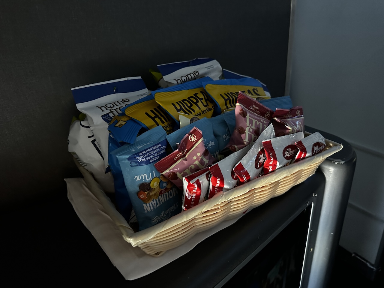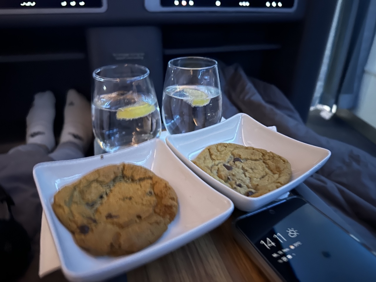 Etwa eine Stunde vor der Landung duftete es nach frisch gebackenen Cookies, diese wurden mit Getränken serviert. Wer dazwischen noch Hunger oder Lust auf süße oder salzige Snacks hatte, konnte sich aus dem bereitgestellten Korb bedienen.