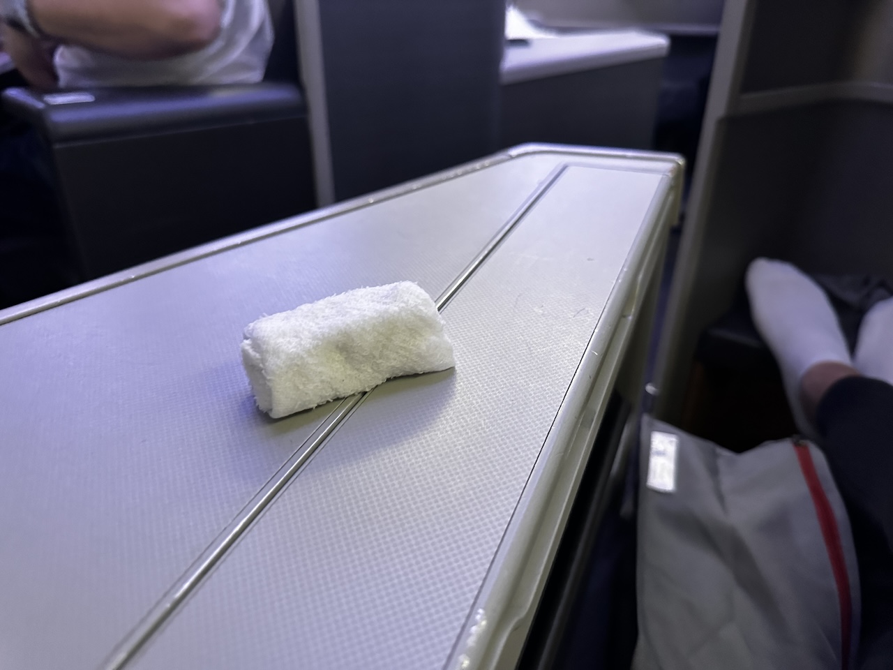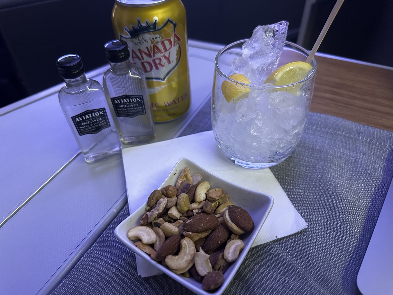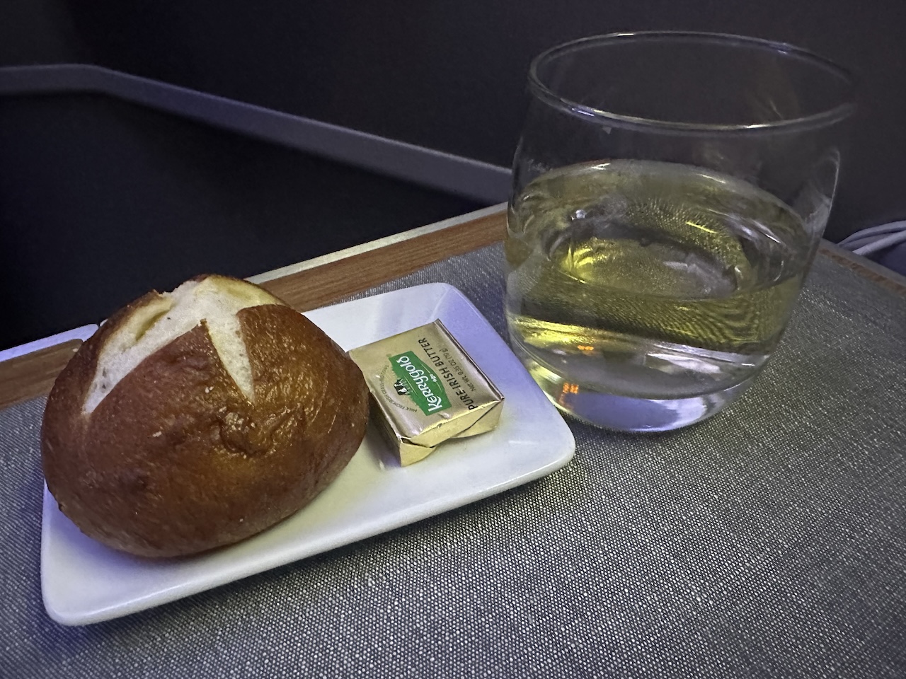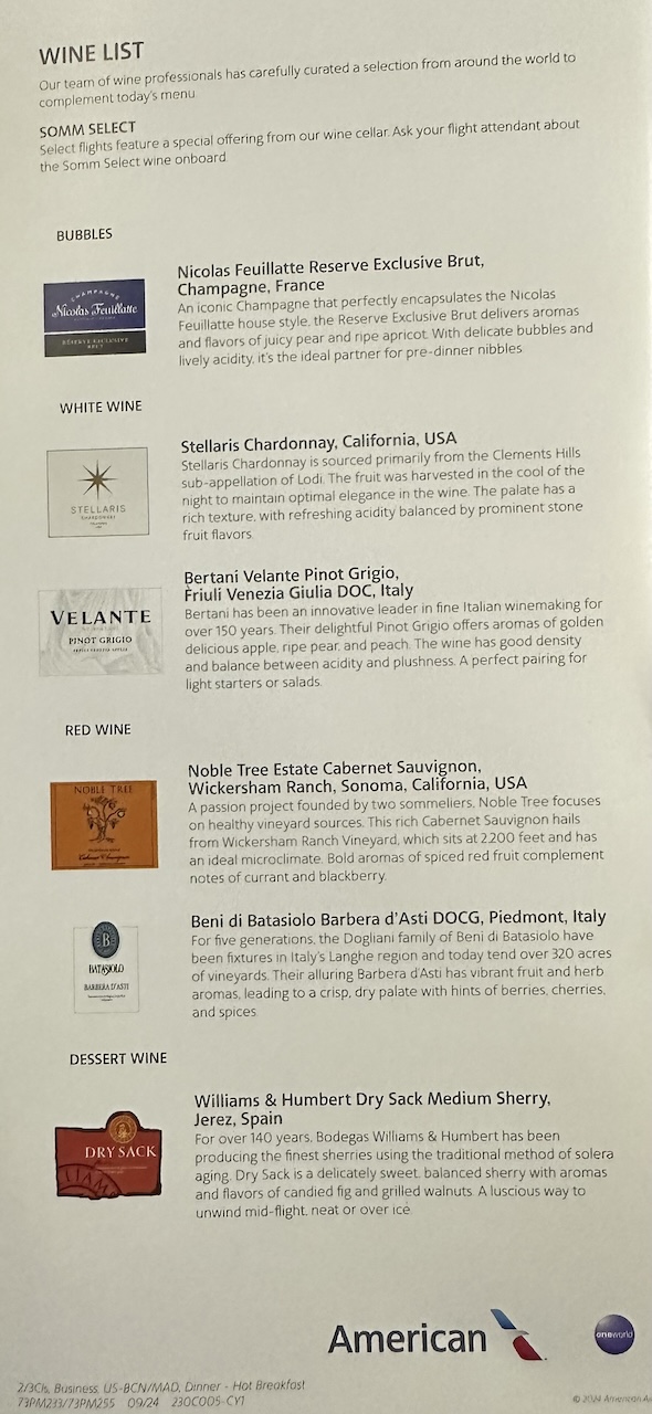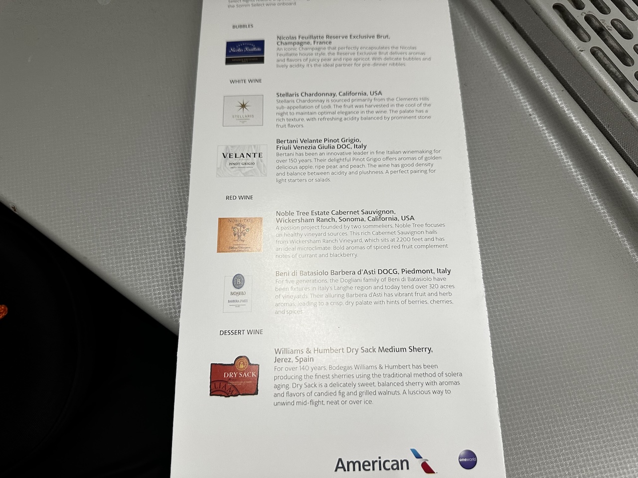 Die Hektik beim Service ist bei Flügen von USA nach Europa inzwischen bei allen Airlines normal, da die meisten Passagiere in First und Business Class so schnell wie möglich schlafen möchten. Da soll schnell Ruhe in der Kabine einkehren. Beim Champagner überrascht mich One World immer mit Originalität. Außer bei Qatar Airways gibt es bei One World fast nur noch Nicolas Feuilatte.