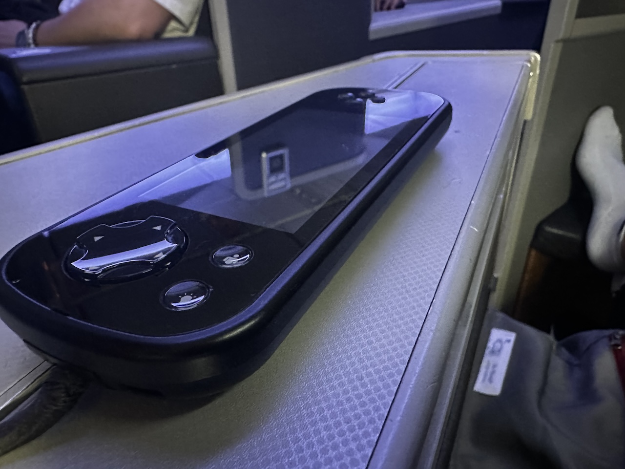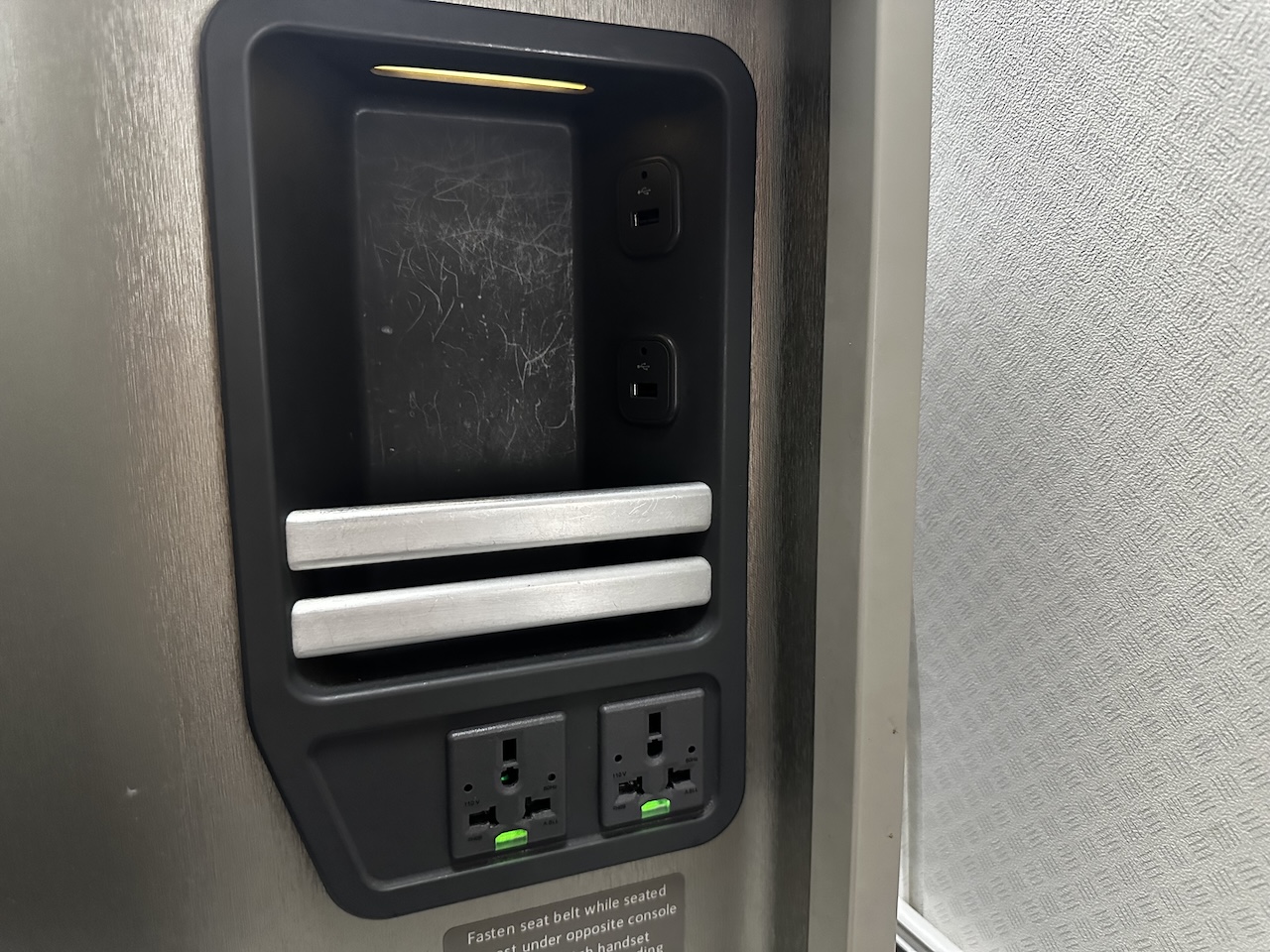 Am Sitz waren gleich zwei Steckdosen, zwei USB-Schnittstellen, zwei Leselampen und je eine Fernbedienung für den Sitz und den Monitor.