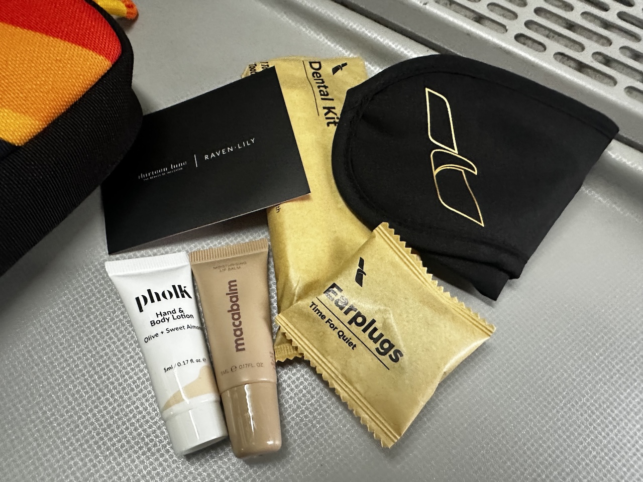 Außer den Bettwaren war auch ein Amenity Kit ausgelegt. Darin die üblichen Dinge wie Schlafmaske, Ohrstöpsel und Pflegeprodukte.